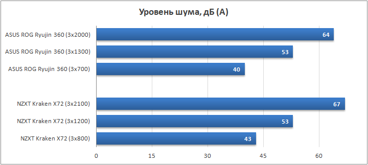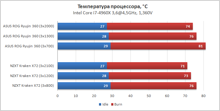 Результаты теста стали для меня неожиданными. ASUS ROG Ryujin 360 уступил NZXT Kraken X72 по три градуса температуры процессора на высоких скоростях вентиляторов и целых пять — на пониженных. Удивляют такие показатели в основном потому, что конструктивно эти СВО одинаковы и обладают идентичным радиатором и помпой. Из этого следует, что разницу в температурах дают те элементы, которые отличаются, а именно — вентиляторы и подошва водоблока. Напомню, что у X72 основание имеет коническую форму, а у Ryujin 360 — ровную. Что же до вентиляторов, то все указывает на то, что пропеллеры NZXT Aer P120 более производительны на радиаторе, хотя и чуть шумнее, чем Noctua NF-F12, что особенно заметно на пониженной скорости. Кроме того, выигрыш в два градуса по температуре не стоит того уровня шума, который слышит пользователь при 2000 об/мин и обе системы достаточно тихие и эффективные и на 1300 об/мин.