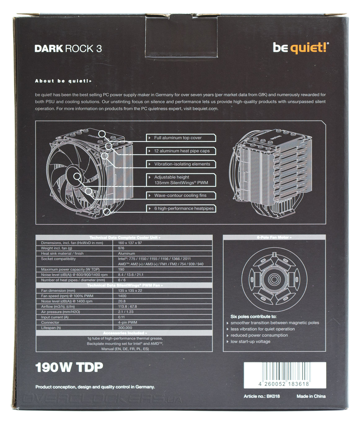 На обратной стороне коробки приведены основные технические характеристики кулера и информация о совместимости с различными процессорными разъемами. Привлекает внимание упоминание о том, что в статоре вентилятора используется не четыре магнитных обмотки (как обычно), а целых шесть, что позитивно сказывается на уровне вибраций, шума, энергопотребления и минимального стартового напряжения.