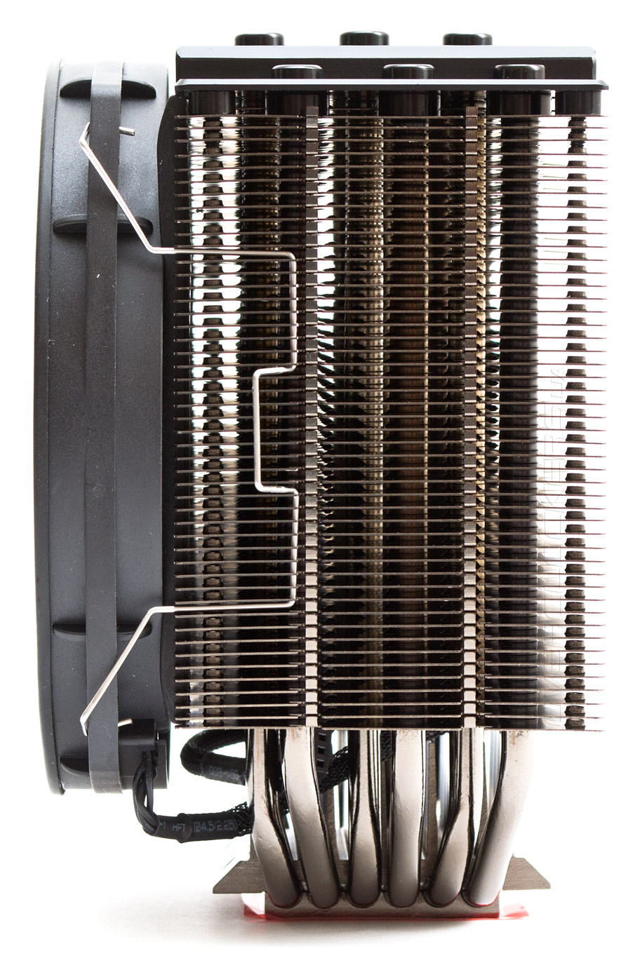 Вентилятор крепится к радиатору при помощи проволочных скоб, которые рассчитаны на стандартный посадочный размер в 120 мм. Сзади можно установить еще один дополнительный пропеллер. Скобы для него есть в комплекте. Высота кулера по нижнему снимку составляет 160 мм. Сбоку видны шесть 6-мм тепловых трубок, расположенные в ряд, друг за другом.