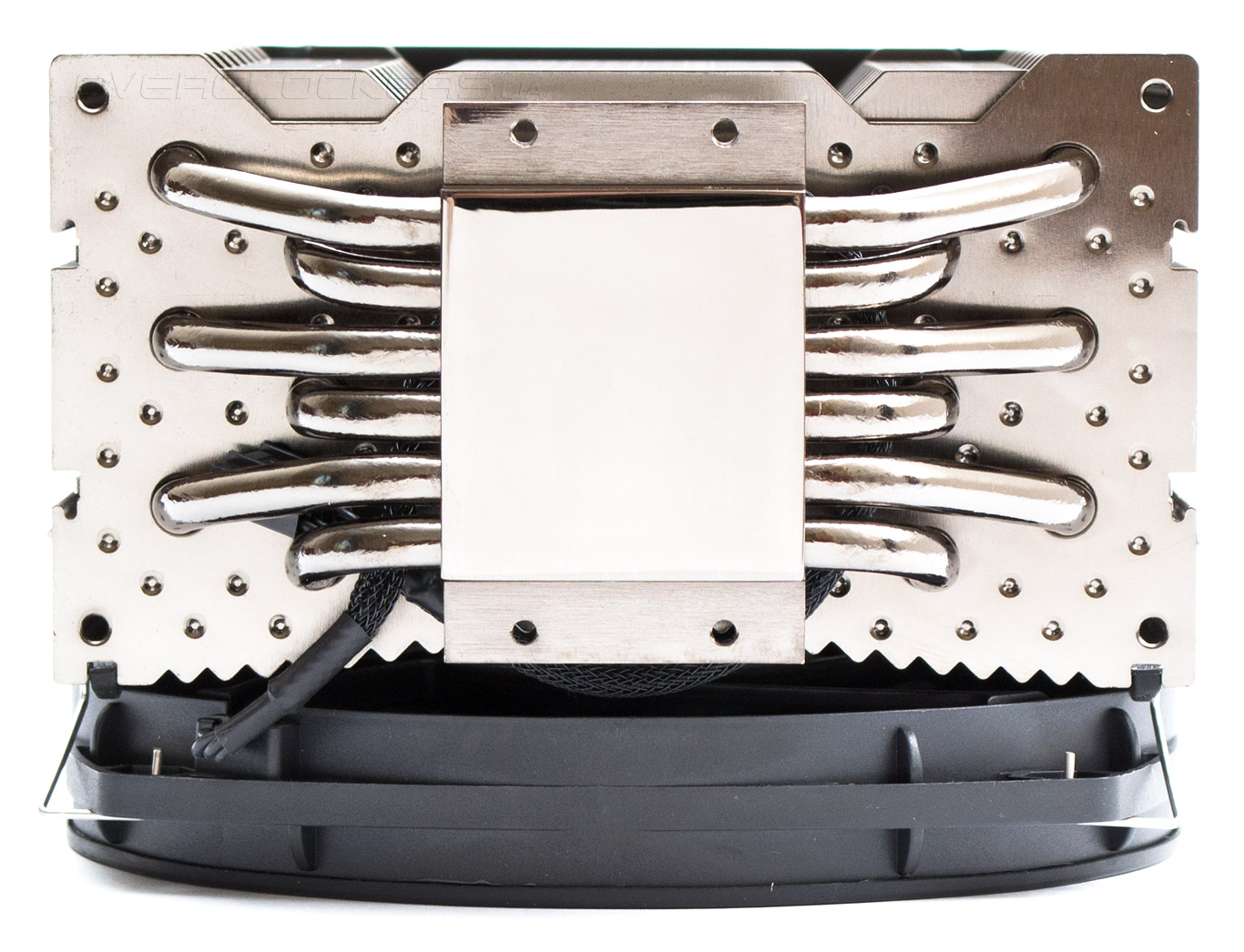 При взгляде снизу становится заметной почти прямоугольная форма радиаторных пластин. Тепловые трубки, при стандартной ориентации кулера, пролегают параллельно относительно кристалла процессора, что не очень хорошо сказывается на скорости отдачи тепла. Но цельная подошва частично компенсирует данный недостаток конструкции.