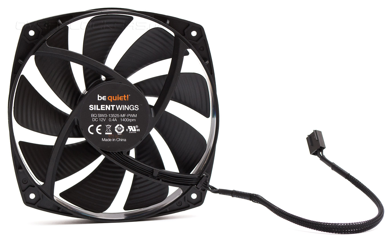 Крупный передний вентилятор сделан по фирменной технологии be quiet! — Silent Wings. Девять лопастей имеют специальные поперечные канавки, снижающие аэродинамические шумы. А рамка вентилятора с обеих сторон снабжена резиновой окантовкой.