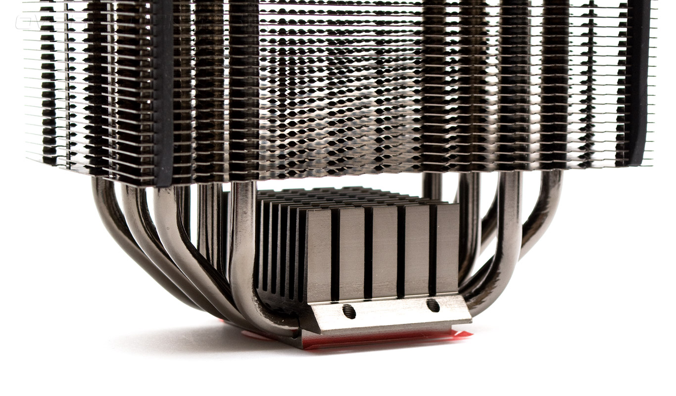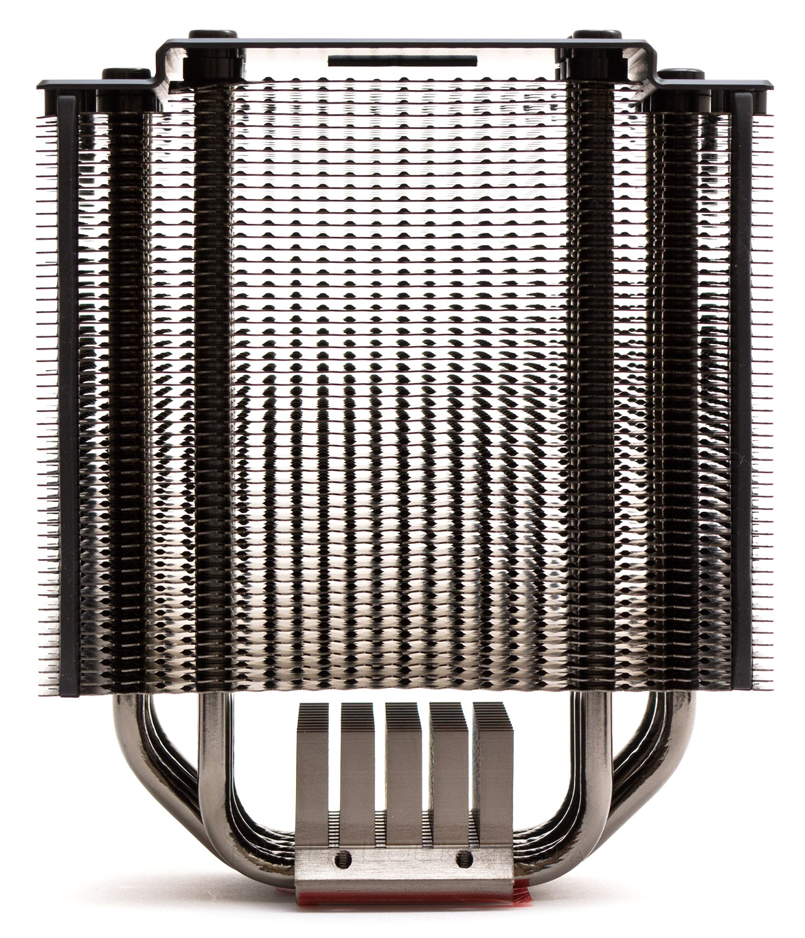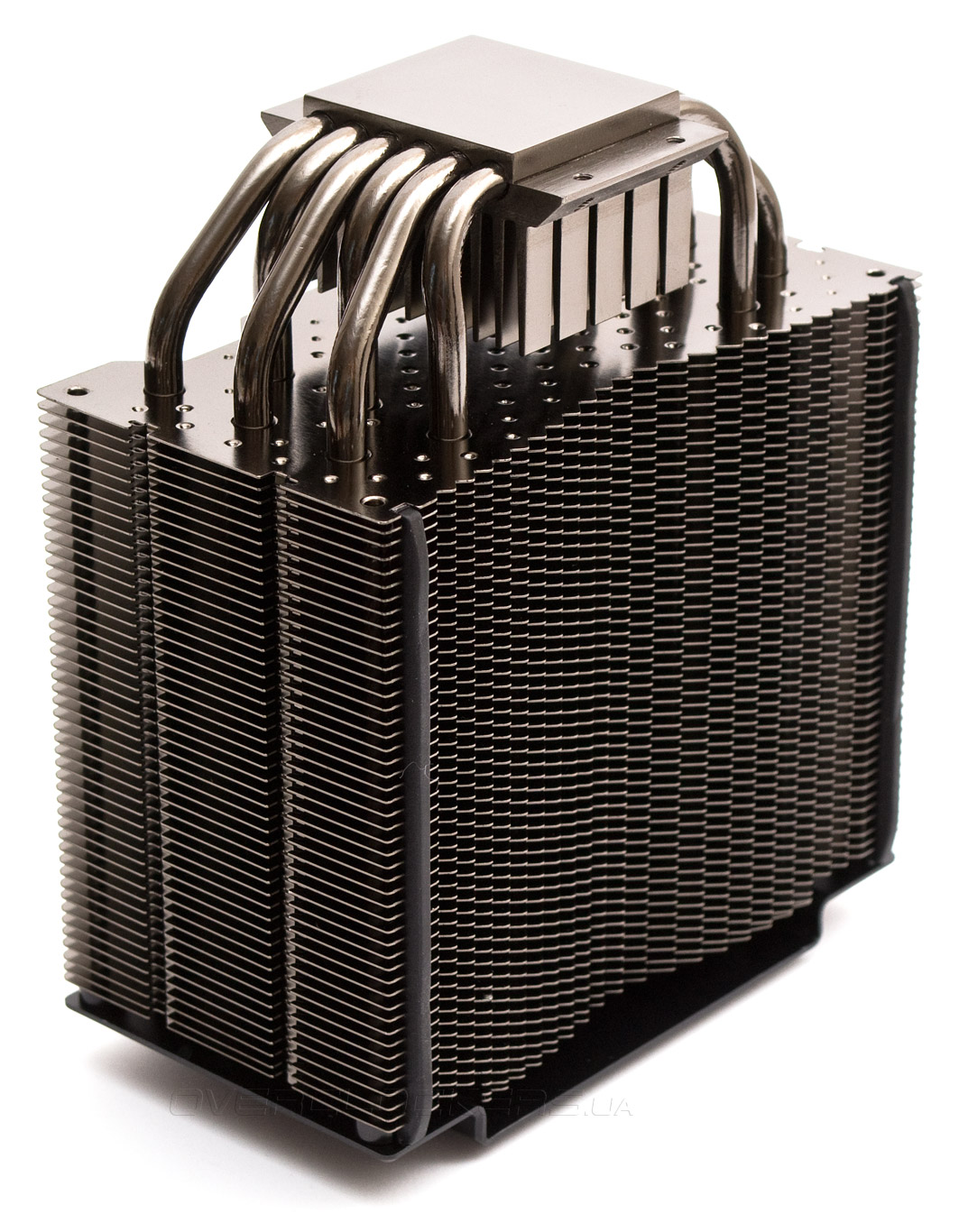 Тело радиатора состоит из 51 пластины (три самые короткие расположены сверху). Ребра толщиной 0,5 мм расставлены с зазором в 2 мм между собой. Если присмотреться внимательно, даже в этом ракурсе на поверхности пластин будет заметно множество маленьких горбиков. Это первая аэродинамическая оптимизация кулера. Выемки одновременно увеличивают площадь рассеивания ребер и создают турбулентные завихрения воздуха, позволяющие более эффективно отводить тепло. Тепловые трубки разведены в стороны U-образно. Получилось по два ряда с каждой стороны и по три трубки в каждом ряду.