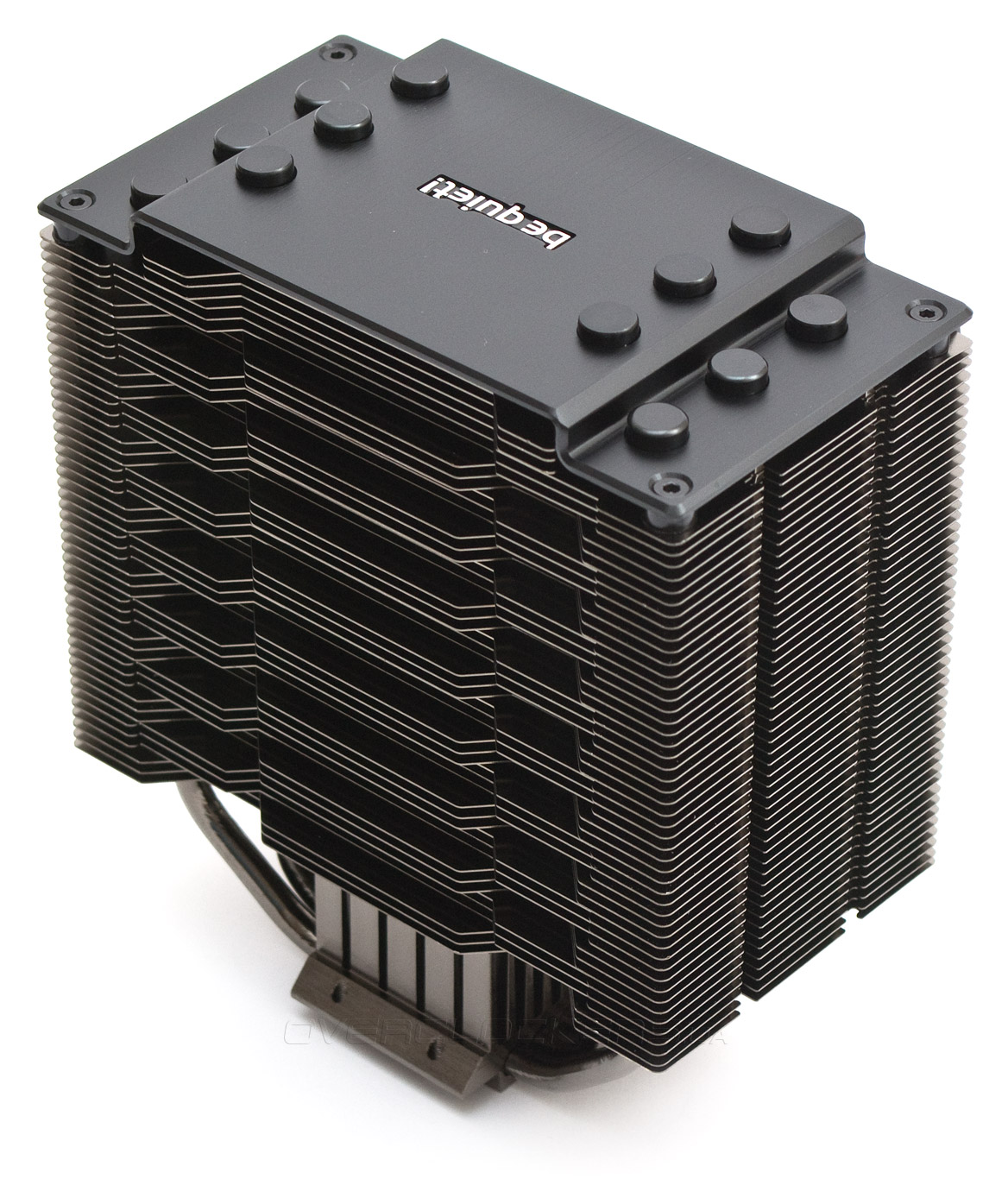 Верхняя крышка, выполненная из массивного листа шлифованного алюминиевого сплава, может по праву считаться основной достопримечательностью в дизайне кулера. И она действительно впечатляет. Ведь именно эта часть системы охлаждения будет видна из корпуса при условии наличия бокового окна. Концы тепловых трубок закрыты пластмассовыми колпачками, по центру приклеен серебристый логотип be quiet!. Производитель позаботился о том, чтобы пластину было сложно демонтировать, закрепив ее специфическими шестиугольными винтами.