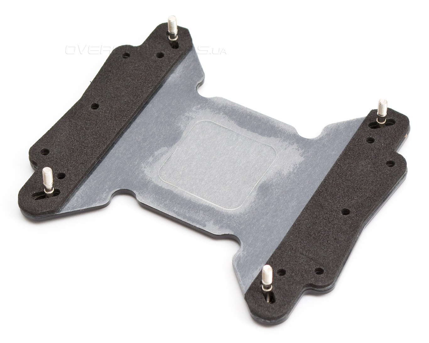 Продеваем крепежные шпильки сквозь нужные отверстия в усилительной пластине, изолированная часть которой должна быть обращена к материнской плате.
