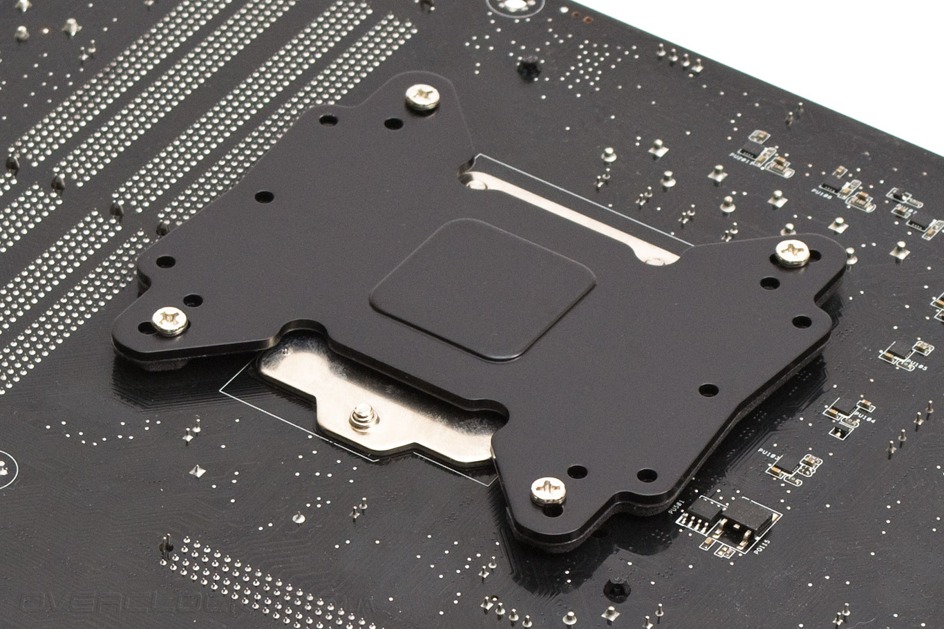 Прикладываем пластину к обратной стороне «материнки». Усилительный элемент может иметь только одну ориентацию на данном процессорном разъеме.