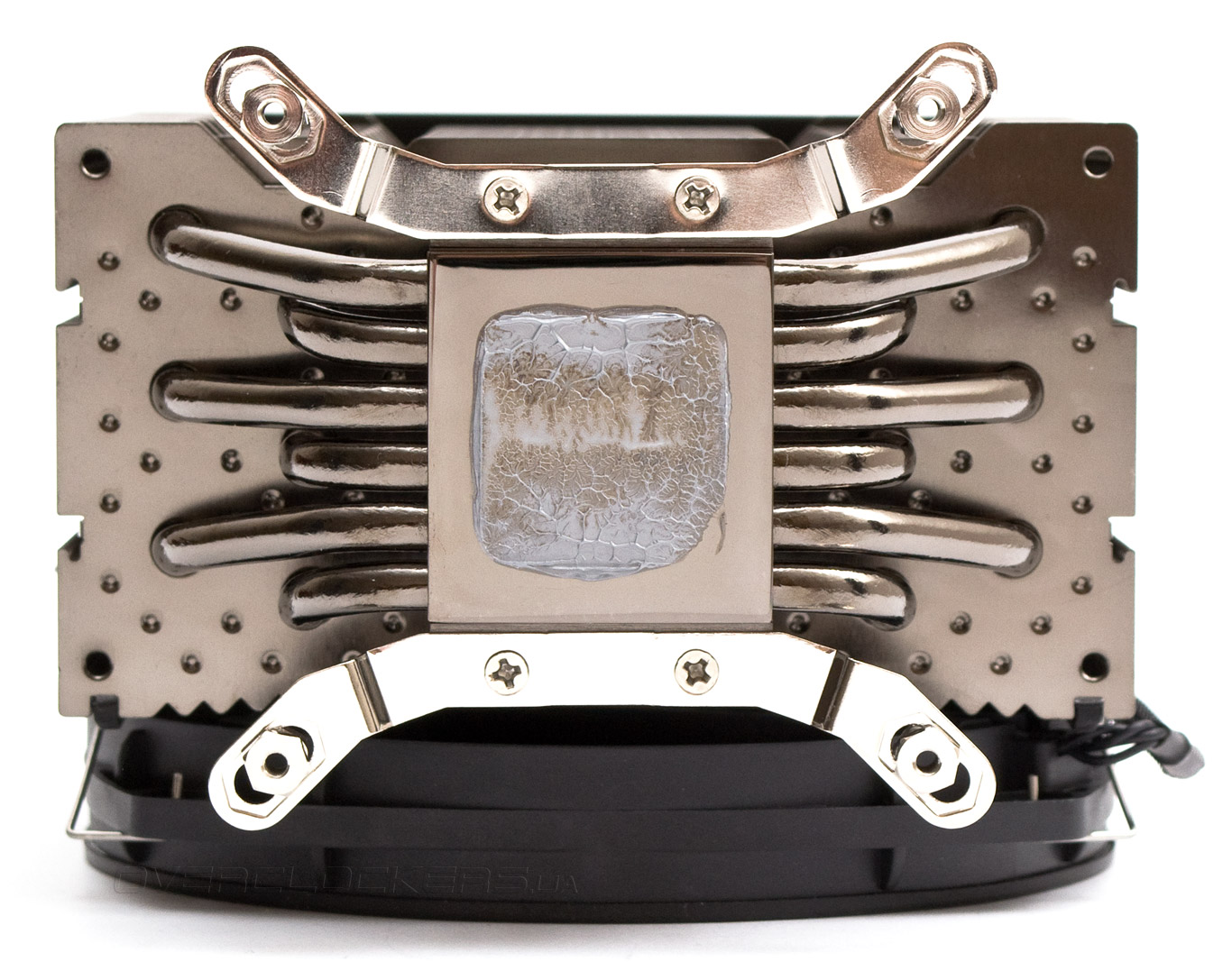 Отпечаток термоинтерфейса на подошве кулера указывает на очень большую силу прижима и подтверждает предварительные выводы про выпуклость по центру основания.
