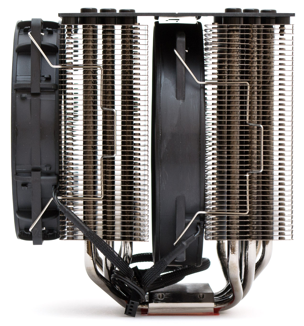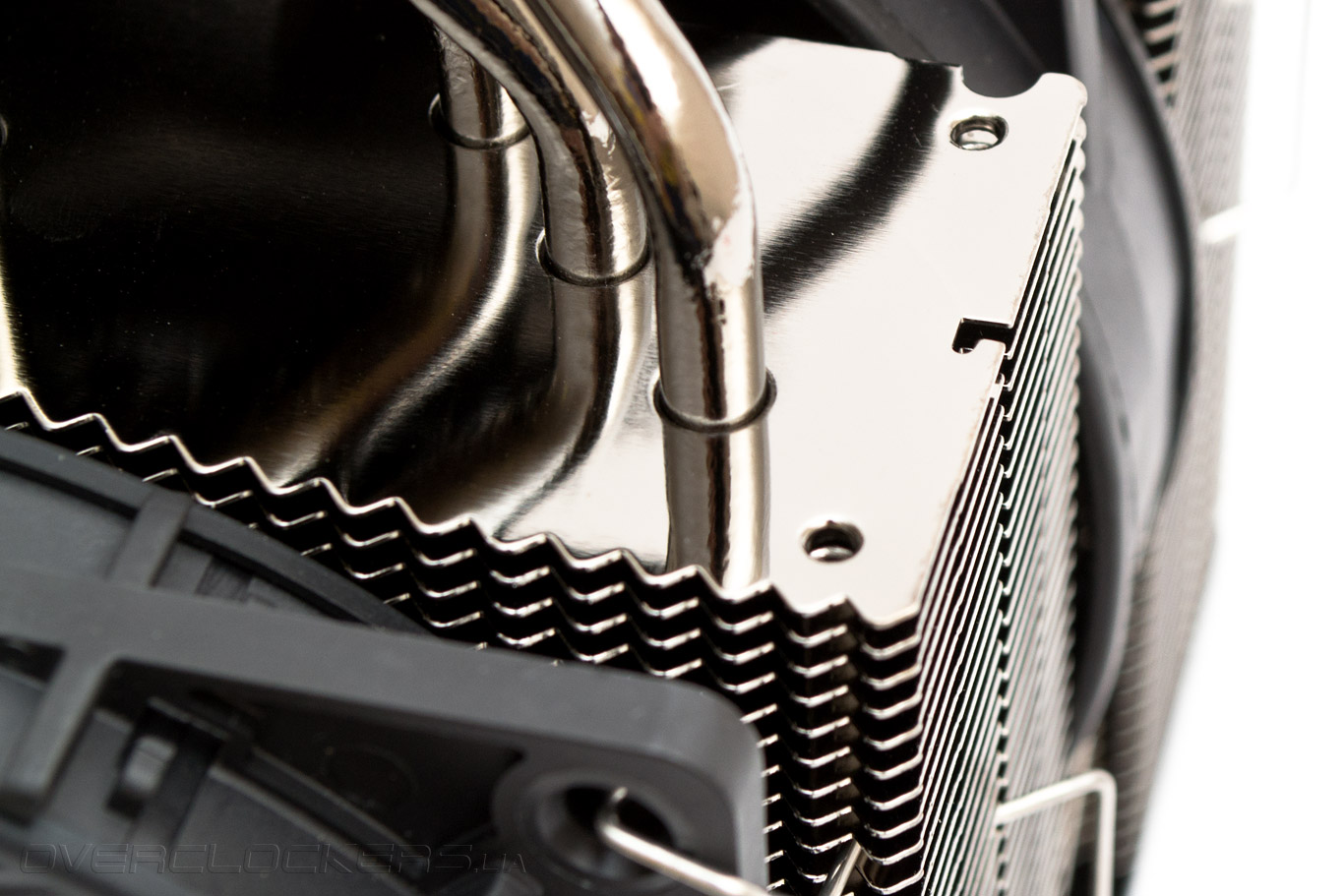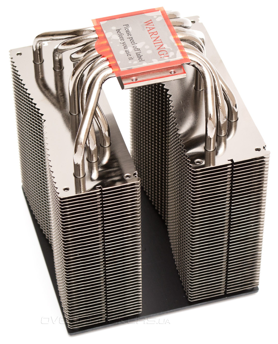 Каждая секция радиатора состоит из 44 алюминиевых пластин, покрытых никелем и расположенных с зазором в 2 мм. С установленным в середину вентилятором, кулер достигает в ширину 138 мм, однако крепежные скобы выпирают еще дальше, вероятно дотягиваясь до первого слота PCI-E в установленном состоянии.