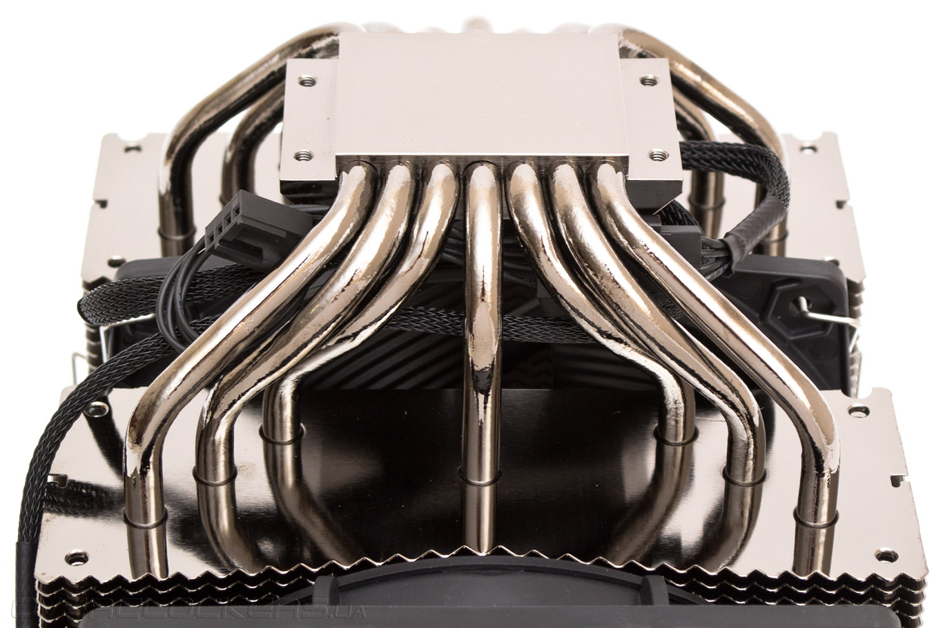 Основание кулера медное, покрытое никелем. Оно имеет вытянутую прямоугольную форму, ведь через него проложены целых семь 6-мм тепловых трубок. Центральная трубка проходит через радиатор прямо, а боковые разведены стрелообразно.