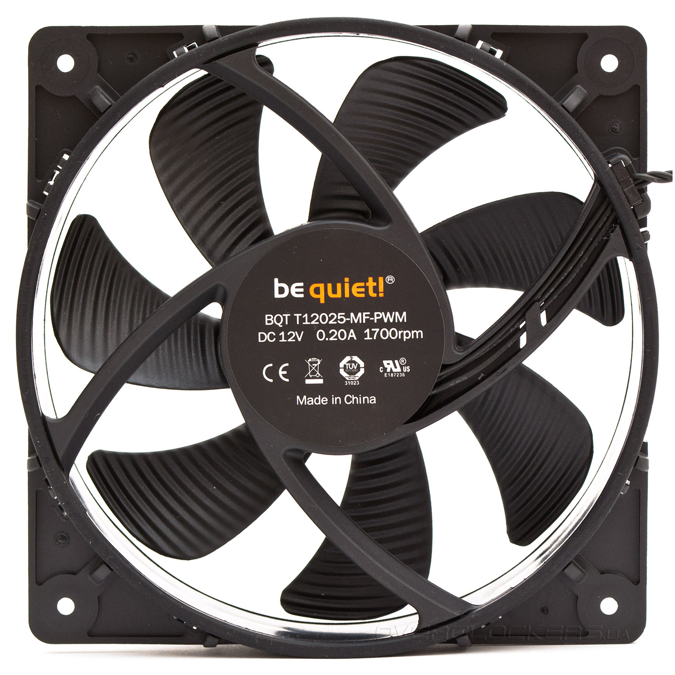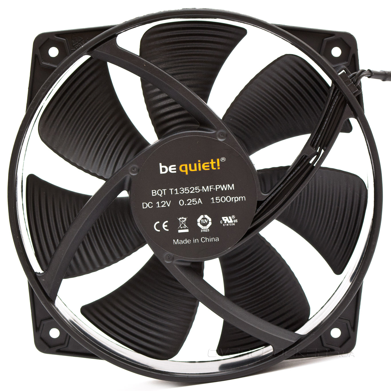 Итак, комплектные вентиляторы. Слева мы расположили 135-мм модель, имеющую более крупные и пологие лопасти, а справа — 120-мм пропеллер со стандартной для be quiet! крыльчаткой. Оба экземпляра имеют четырехконтактное подключение к питанию, а управление скоростью осуществляется посредством ШИМ-модуляции.