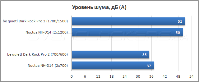 Сравнение эффективности кулеров производилось по соотношению температуры к создаваемому уровню шума. Для be quiet! Dark Rock Pro 2, у которого скорость крыльчатки регулируется с помощью ШИМ, значение шума составило от 35 до 51 дБ (А). Noctua NH-D14 имеет фиксированные скорости. При низких оборотах мы получили 37 дБ (А), а при максимальных — 50 дБ (А). Субъективно, оба кулера работали очень тихо на минимальной скорости.