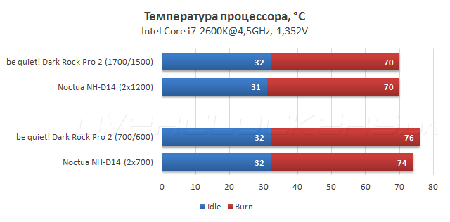 Be quiet! Dark Rock Pro 2 практически не уступает Noctua NH-D14 по качеству охлаждения в пересчете на шумовые характеристики. Очевидно, что на небольшой поверхности нашего процессора оба кулера работают не в полную силу и часть тепловых трубок простаивает. В полной мере они смогут раскрыть себя на платформах AMD и Intel LGA2011, обладающих большей площадью теплораспределителя. Можно поприветствовать be quiet! Dark Rock Pro 2 с поступлением в ряды супер-кулеров.