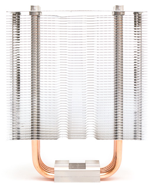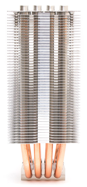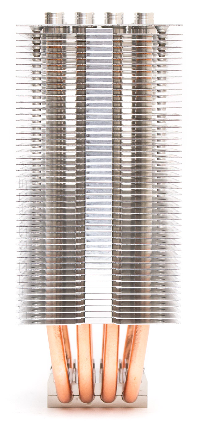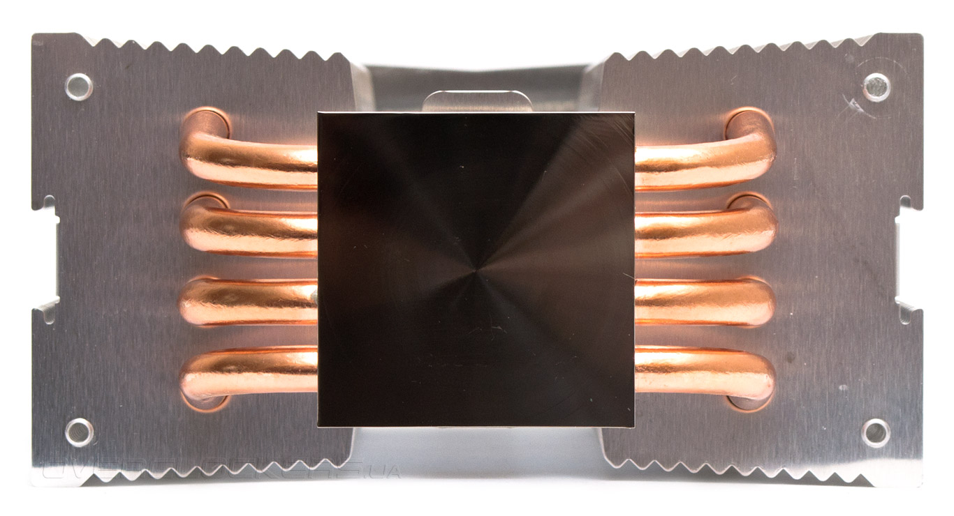Четыре тепловые трубки диаметром 6 мм расположены в теле радиатора строго в ряд, друг за другом. Это не самый оптимальный вариант с точки зрения распределения тепла по ребрам, но зато создается минимум препятствий для движения воздуха и, как следствие, уменьшается общий уровень шума от работающего вентилятора. Улучшает акустику и приличный зазор в 2 мм между радиаторными пластинами.