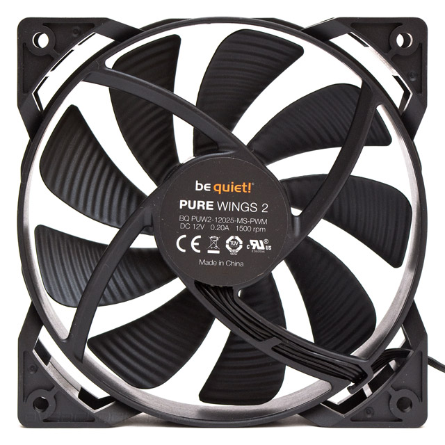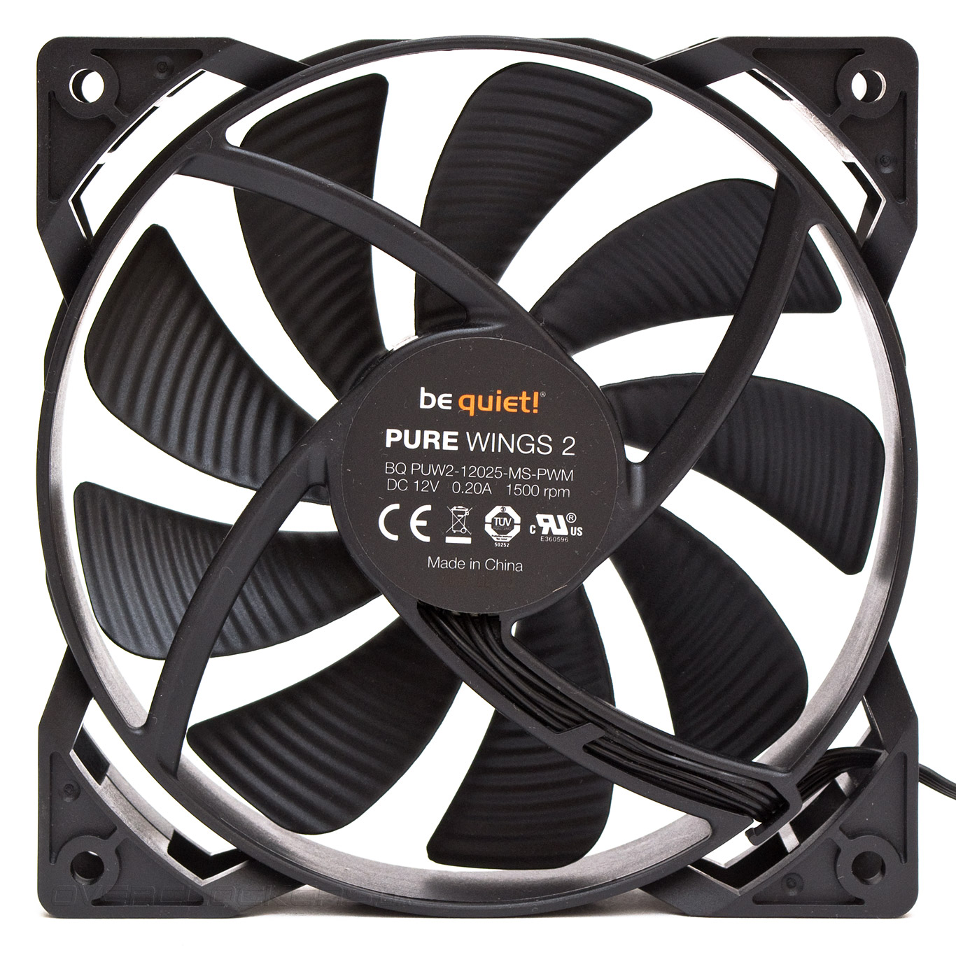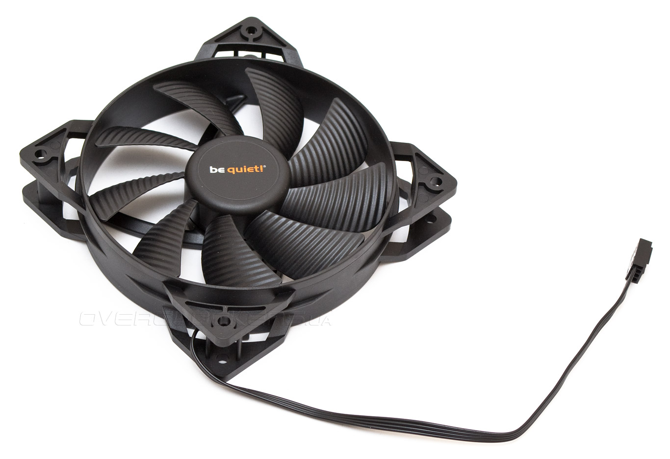 Используемый здесь вентилятор тоже относится к серии Pure Wings 2. То есть, по сути, это корпусной вентилятор, сделанный на базе подшипника скольжения втулочного типа. Лопасти покрыты специальными поперечными каналами, уменьшающими уровень аэродинамических шумов. Большое преимущество заключается в том, что этот пропеллер изумительно тихий. На максимальных 1600 об/мин уровень его шума не превышает 50 дБ (А). При этом отсутствуют паразитные призвуки. При 1000 об/мин получаем 40 дБ (А) — уровень звукового давления, который будет неразличим на слух из закрытого корпуса. А на стартовых оборотах (450 в минуту при ШИМ-управлении) звук крыльчатки полностью сливается с фоном. Минимальное стартовое напряжение составляет 5 В. Обратная сторона тишины — низкое статическое давление, из-за чего радиатор будет продуваться не самым лучшим образом.