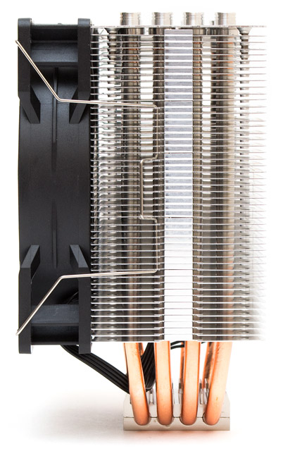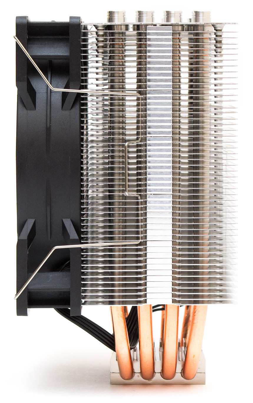Если смотреть сбоку, то видно, что тепловые трубки расположены с зазором в 6 мм между собой. Пластин в теле радиатора насчитывается 48 штук, а общая площадь рассеивания составляет 6350 см². Интересной и приятной особенностью данного радиатора является его высота — всего 155 мм. В отличие от стандартных 160-мм башен, Pure Rock обладает большей совместимостью с узкими корпусами.