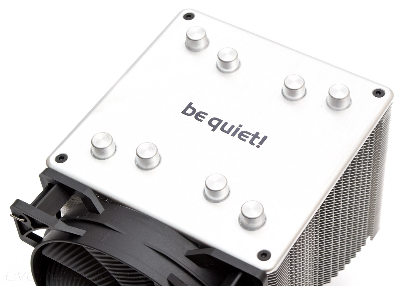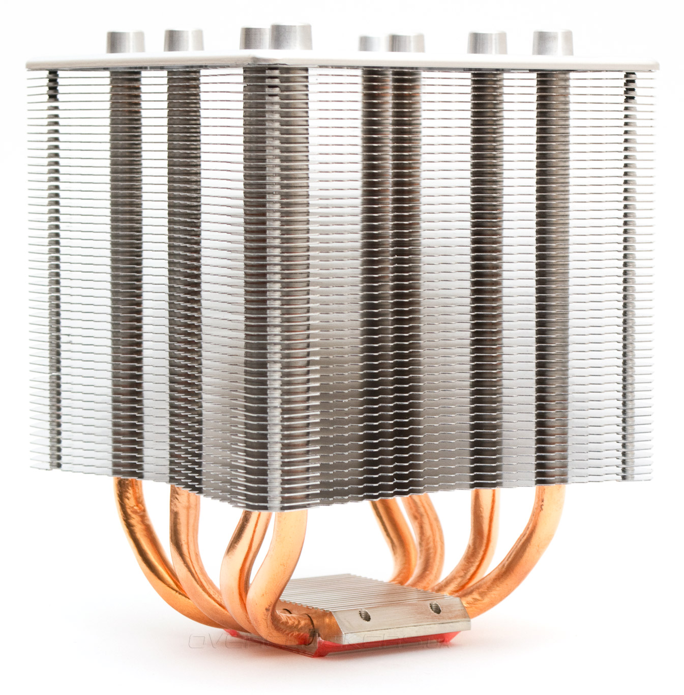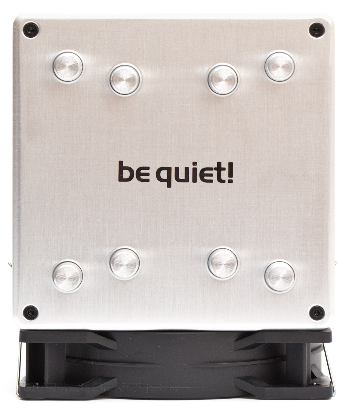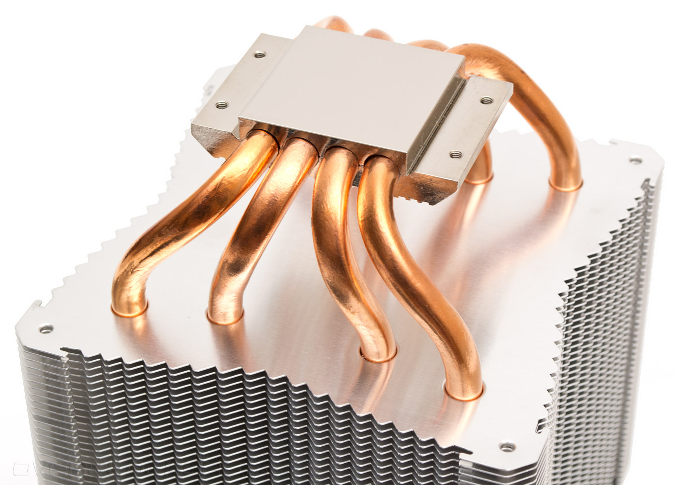 Восемь концов тепловых трубок закрыты металлическими колпачками. Пластина держится на четырех винтах, имеющих шляпки с формой под шестигранный ключ.