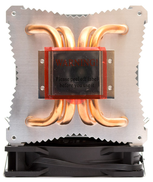 Взгляд на кулер снизу открывает нам, что форма радиаторных пластин на самом деле ближе к четырехугольной звездочке, нежели к квадрату. Основание расположено ровно по центру, поэтому ни горизонтальная, ни вертикальная ориентация кулера нисколько не изменят проекцию его габаритов относительно материнской платы.