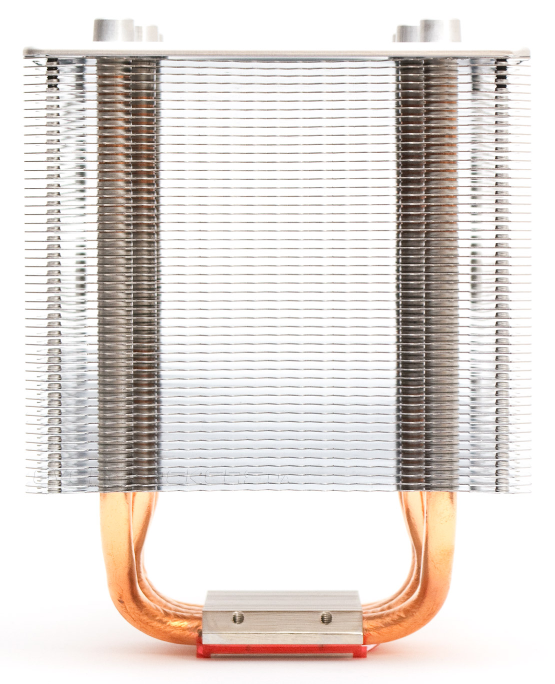 Основание кулера медное, для защиты покрытое никелем. Четыре тепловые трубки проходят через него с зазором в 1 мм друг относительно друга. Следов пайки в месте соприкосновения трубок с подошвой и пластинами радиатора не наблюдается.