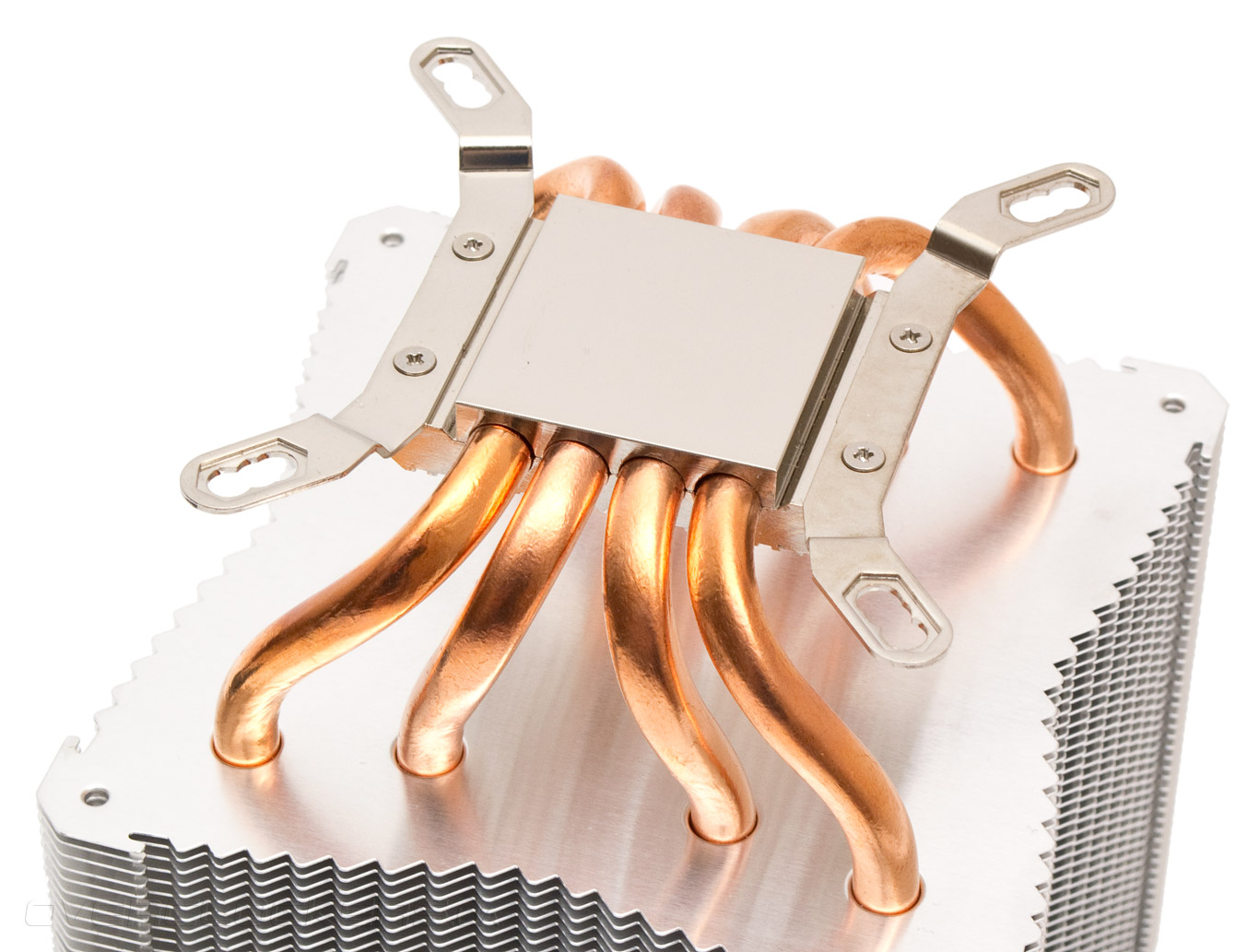 Четыре тепловые трубки имеют нестандартную толщину в 8 мм каждая и равномерно разведены в стороны радиатора. Межреберная дистанция составляет 1,8 мм.
