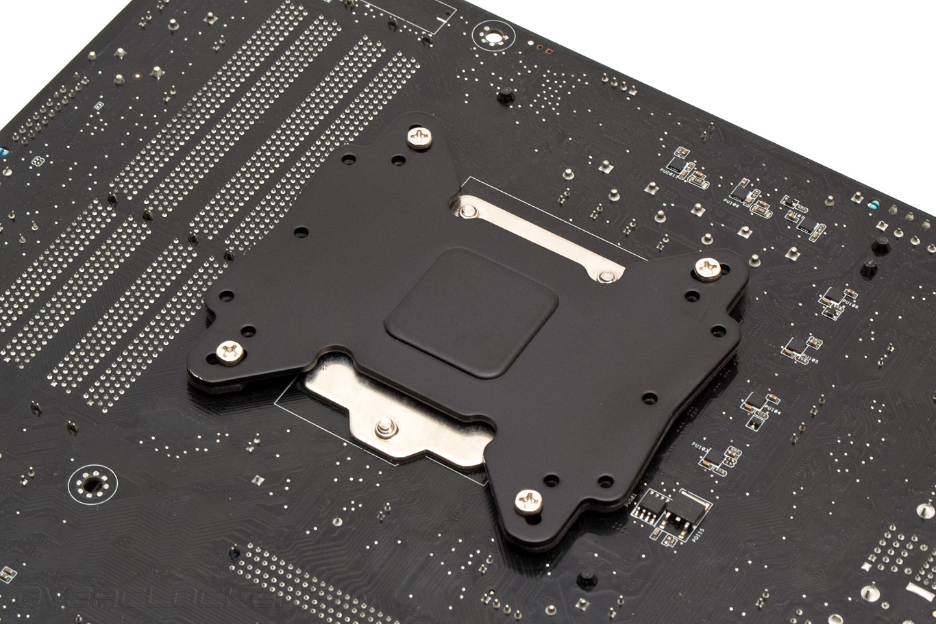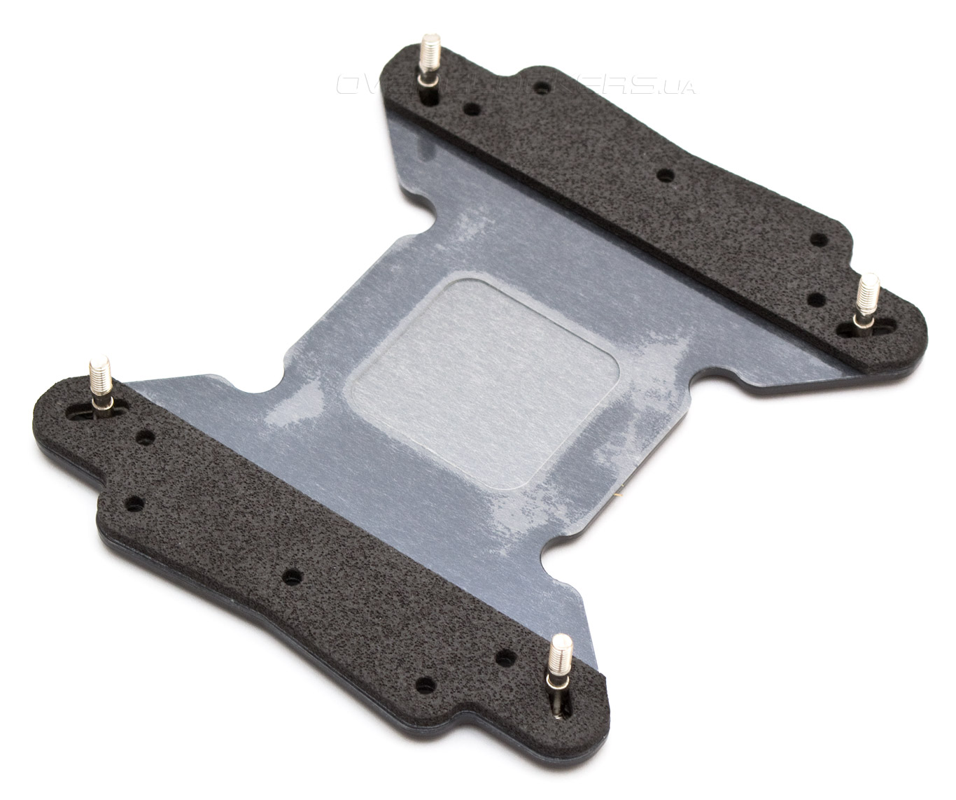 Затем прикладываем пластину к обратной стороне материнской платы. Если сборка производится в корпусе с неудачно расположенным вырезом в поддоне – можно сначала приложить пластину, а шпильки вставить потом.
