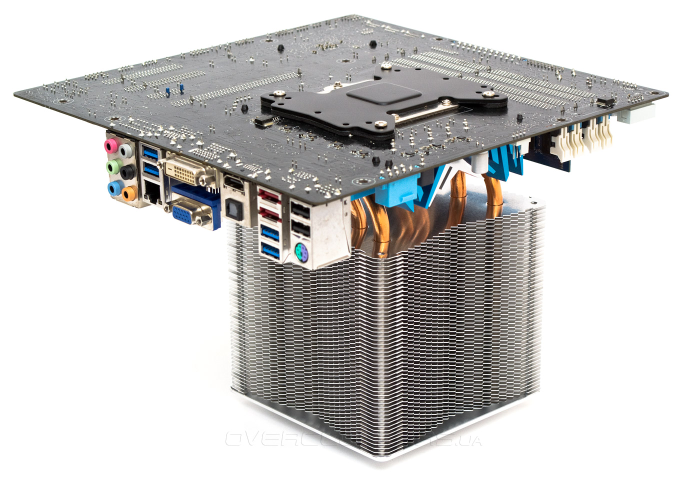 | Материал радиатора и конструкция | Вертикальный радиатор кубической формы, состоящий из алюминиевых пластин, нанизанных на 4 медные тепловые трубки диаметром 8 мм, расположенные U-образно. Основание никелировано | Вертикальная двухсекционная конструкция из алюминиевых пластин, нанизанных на 6 медных тепловых трубок диаметром 6 мм, расположенных U-образно. Тепловые трубки и основание никелированы, все соединения пропаяны | Конструкция из алюминиевых пластин, нанизанных на 5 медных тепловых трубок диаметром 6 мм. Тепловые трубки проходят сквозь медное основание |