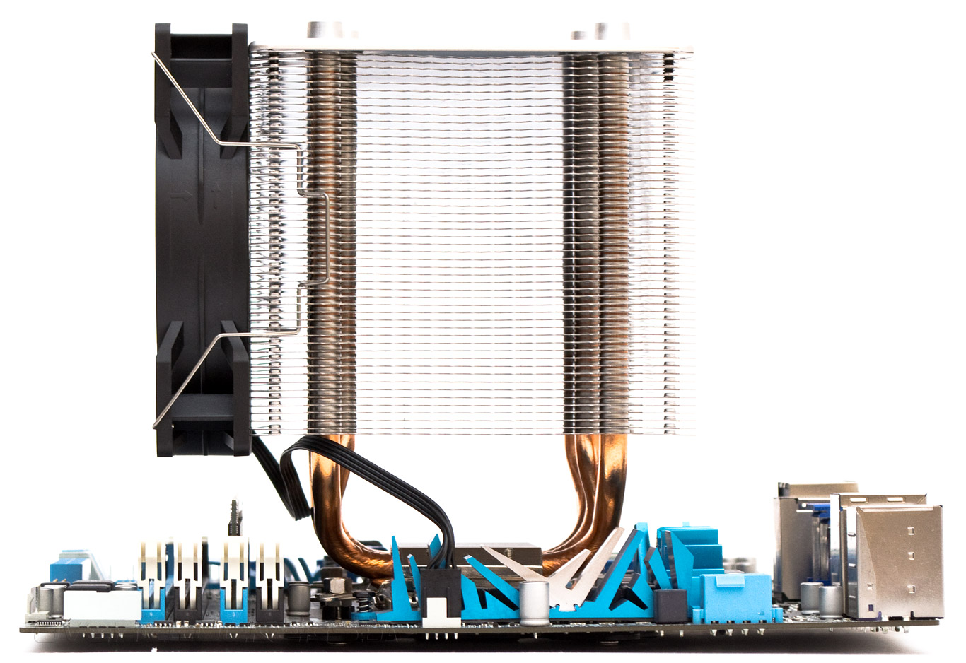 Пластины радиатора улучшены элементами аэродинамической оптимизации. Их грани покрыты зазубринами, напоминающими зубья пилы, призванными снизить турбулентность воздушного потока в угоду лучшей акустике. Кроме того, сделана выемка посередине грани, чтобы создать запас места до вентилятора — это благотворно влияет на уровень шума.