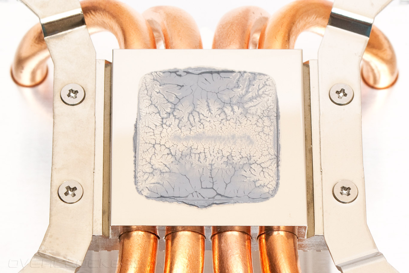 В общем, be quiet! Shadow Rock 2 справился с тепловыделением разогнанного процессора, но потерпел поражение в соревновании с оппонентами, показав не лучший результат по температурам как для такого крупного кулера. Попытаемся проанализировать причины. Первая, очевидно, заключается в вентиляторе. Он вращается очень тихо даже на высоких скоростях, и, вероятно, не создает достаточного статического давления для продува крупных ребер, показывая хороший результат только на максимальных оборотах. И будучи расположенным между двумя рядами трубок он работал бы эффективнее. Второй момент проистекает из отсутствия припоя между основанием, тепловыми трубками и ребрами радиатора. В результате теряется преимущество от крупной площади рассеивания, поскольку тепловая энергия распределяется по телу радиатора недостаточно быстро, о чем красноречиво говорят температуры при низких скоростях вращения. Но основная причина неудачи становится понятной только если взглянуть на отпечаток термоинтерфейса на основании кулера. Через наиболее горячую зону пролегают всего лишь две тепловые трубки, а еще две остаются не у дел.