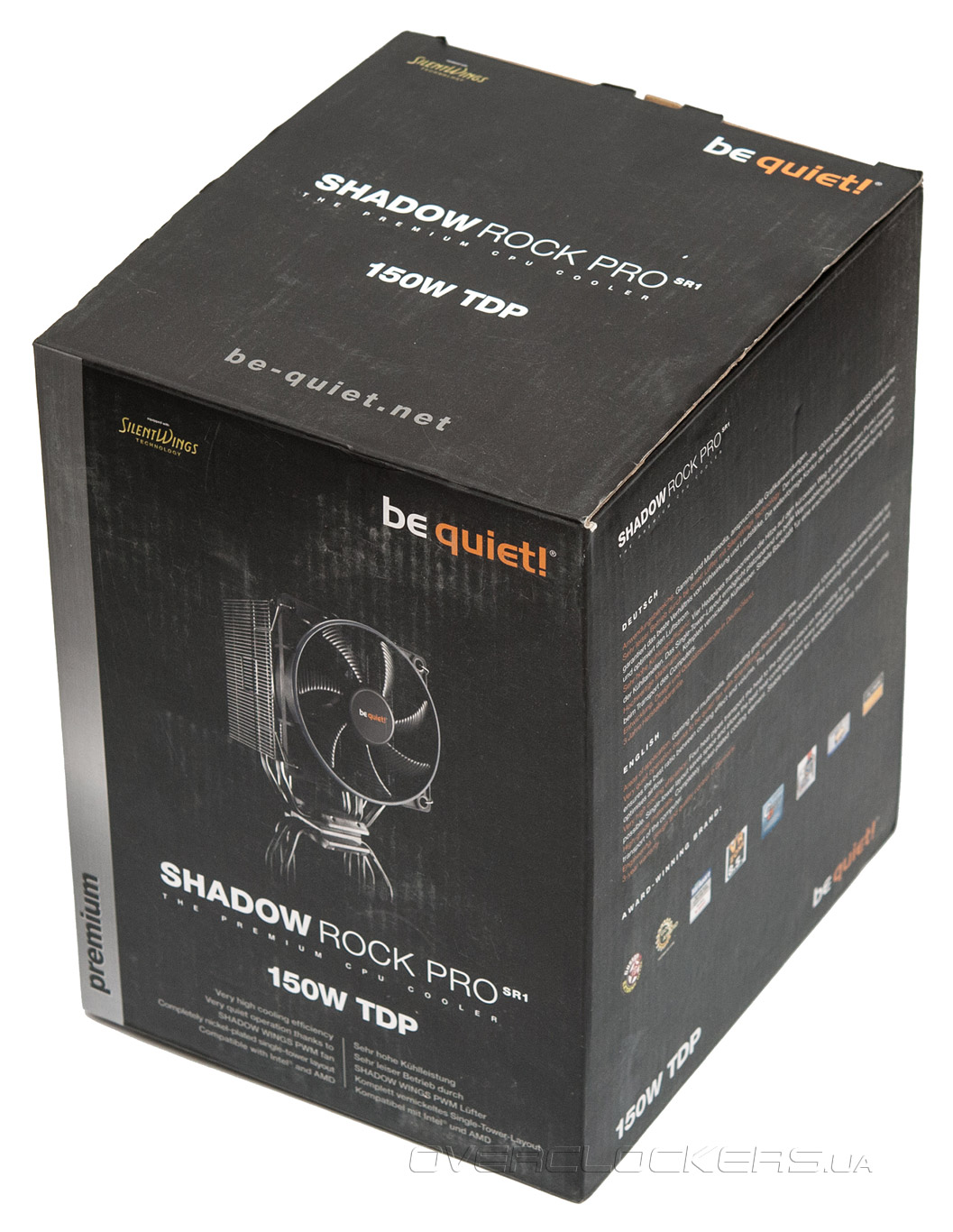 Продукт поставляется в строгой, но весьма стильной чёрной коробке. На лицевой стороне упаковки находится фотография продукта, его название, а также надпись, указывающая на способность охладителя рассеивать до 150 ватт тепла.