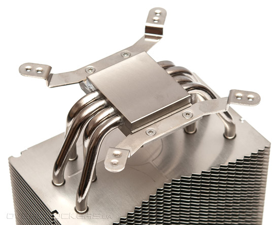 Кулер рассчитан на установку лишь одного вентилятора и только с одной стороны. Пластины радиатора с этой стороны имеют нелинейный профиль. Они немного урезаны к центру в форме треугольника. Края пластин имеют треугольные зубцы. Все эти решения применяются инженерами для повышения эффективности обдува ребёр.