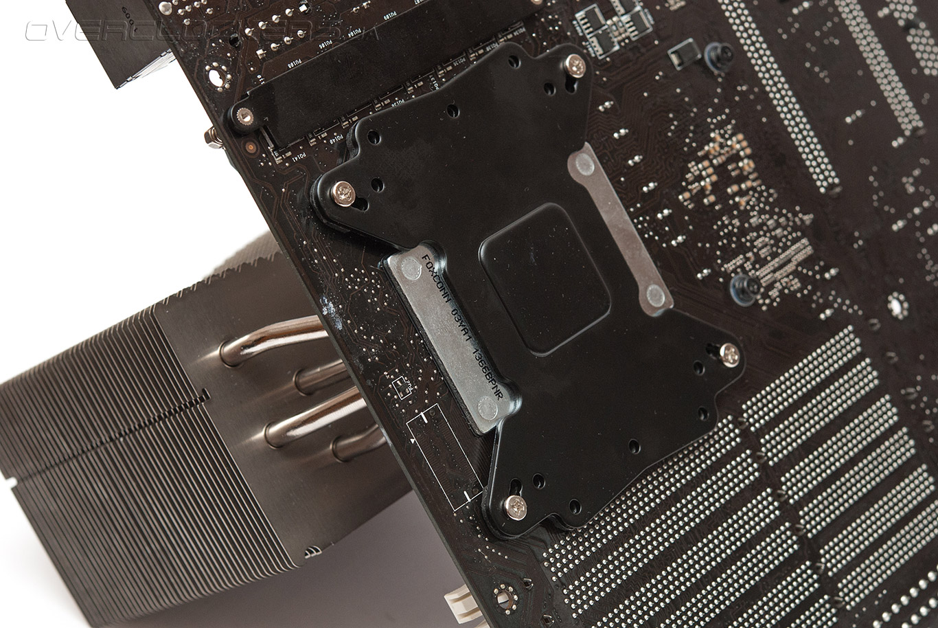 И сразу после этого начинаются «танцы с бубном». Кулер нужно приложить к процессору, а с обратной стороны материнской платы подставить пластину жёсткости и закрутить четыре винта. Всё бы ничего, но винты закручиваются с тыльной стороны. Два человека справляются с этой задачей без каких либо трудностей, однако в одиночку установить кулер не так уж просто. Дело в том, что любой кулер надо ставить сразу ровно и качественно, а не возить им по процессору, хаотически размазывая заранее нанесённую термопасту.