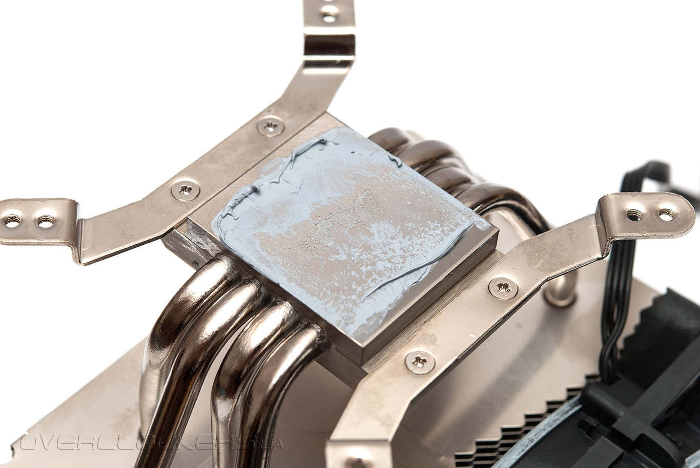 Первым делом необходимо прикрутить крепёжные пластины к основанию кулера.