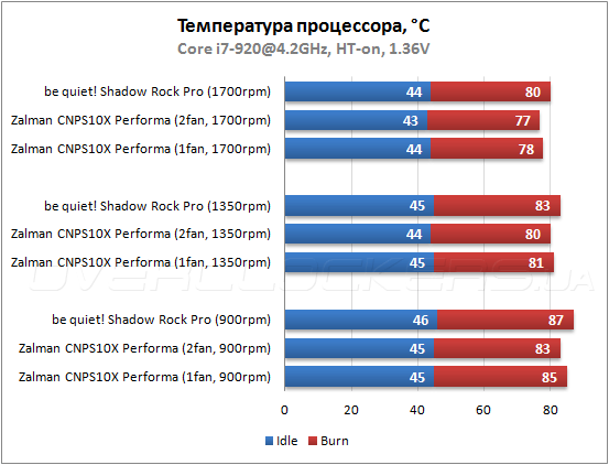 Использовались режимы работы вентиляторов на скоростях 900, 1350, 1700 об/мин. Так же был проведено тестирование Zalman CNPS10X Performa с двумя вентиляторами. У Be Quiet! Shadow Rock Pro возможность установки второго вентилятора отсутствует. Каждое тестирование систем охлаждения проводилось два раза с заменой слоя термопасты, чтобы свести к минимуму погрешность измерений.