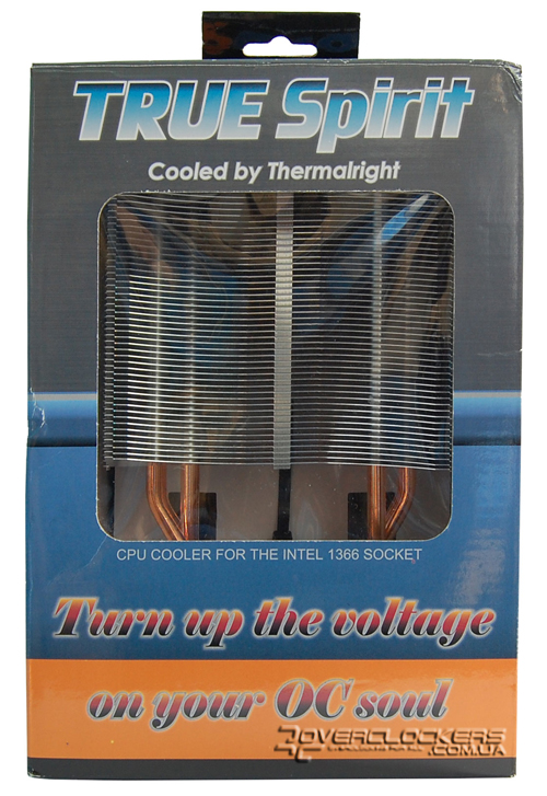Кулер TRUE Spirit поставляется в картонной коробке с окошком, через которое виден радиатор. Cogage в общем-то и не скрывает свою родословную и прямо на коробке мы видим надпись «Cooled by Thermalright».