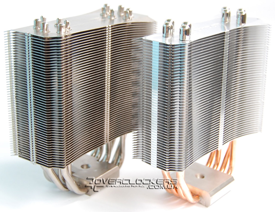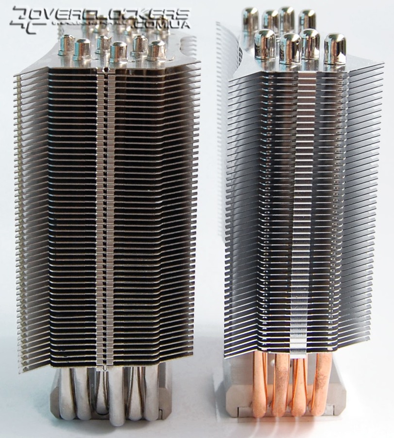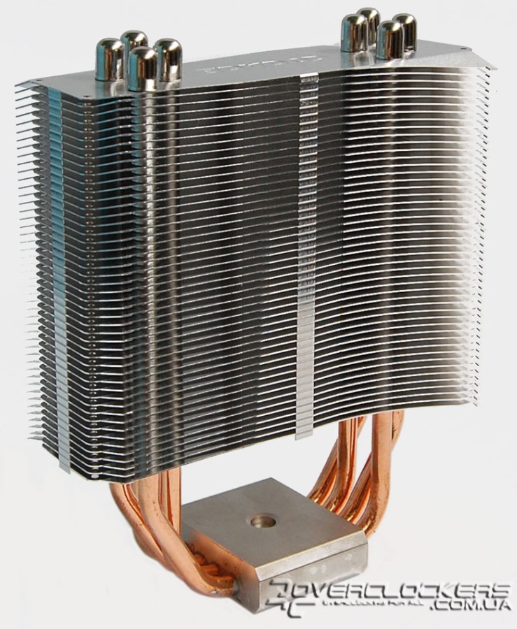 На верхней пластине по традиции красуется логотип компании, только уже другой. Перфорированных отверстий в пластинах нет. Тепловые трубки, как и в прототипе, пронизывают пластины радиаторы с небольшим смещением, чтобы более равномерно распределить по ним тепловую нагрузку.