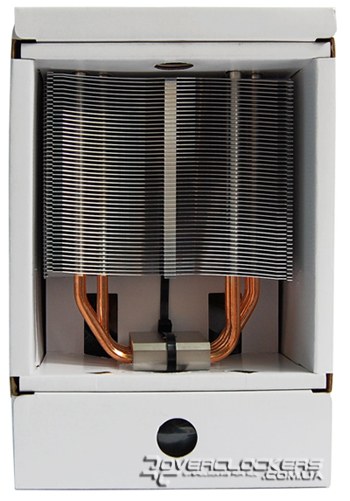 Сам кулер располагается в еще одной картонной коробке, трубки его зафиксированы в специальных отверстиях, а основание закреплено в картонном каркасе с помощью стяжки.