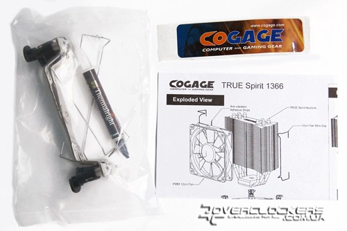 Кулер TRUE Spirit поставляется в картонной коробке с окошком, через которое виден радиатор. Cogage в общем-то и не скрывает свою родословную и прямо на коробке мы видим надпись «Cooled by Thermalright».