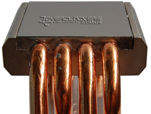 Основание состоит из двух половин, в желобках которых и лежат тепловые трубки. Желобки тщательно подогнаны под размер трубок, место соединения пропаяно (на трубках видны капли припоя).