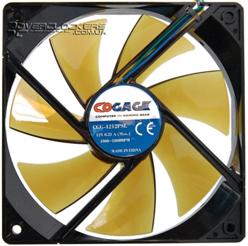 Вентилятор CGG 1212PSL подключается четырехштырьковым разъемом и рассчитан на 1800 оборотов в минуту. Кстати, в характеристиках кулера указано, что рабочий диапазон от 1000 до 1500 об/мин (создавая воздушный поток от 33 до 65,5 CFM) с погрешностью 15%. Так что производитель, возможно, немного лукавит, оставляя небольшой не задекларированный запас. Согласно же мониторингу максимальные обороты составляли примерно 1680 об/мин. Согласно спецификациям уровень шума на минимальных оборотах равен примерно 19,6 дБ, а на максимальных — 37,4 дБ. Крыльчатка вентилятора выполнена из прозрачного пластика желтого цвета, без подсветки.