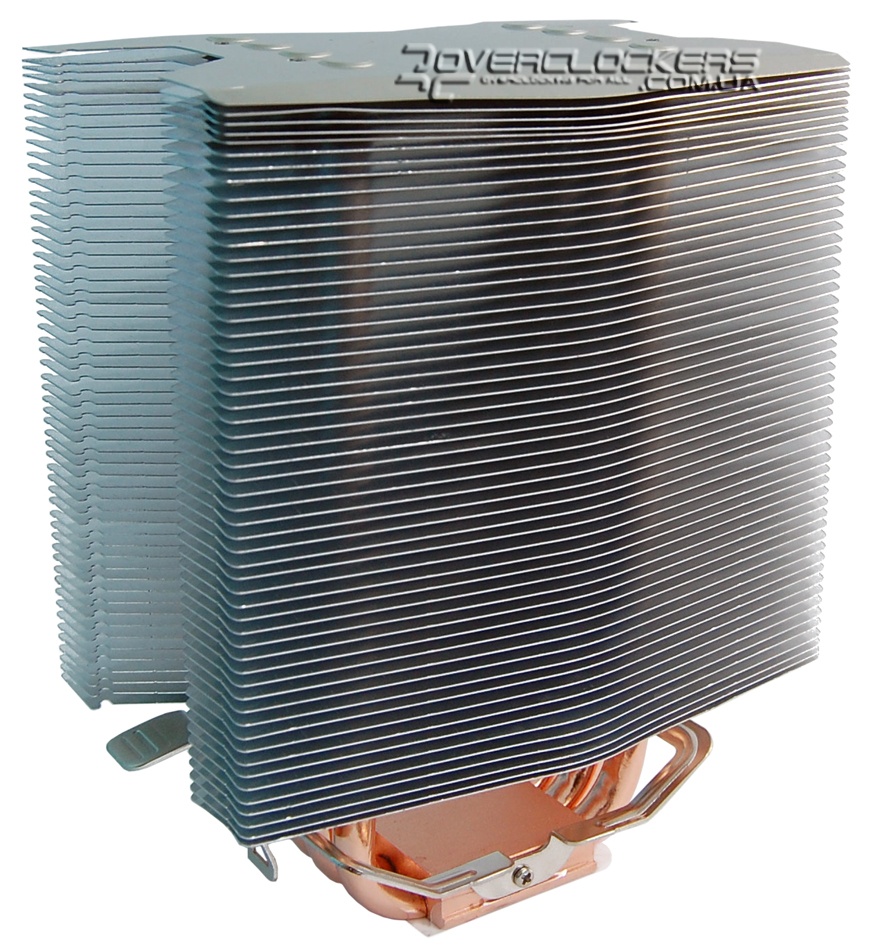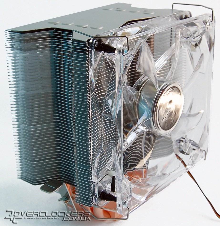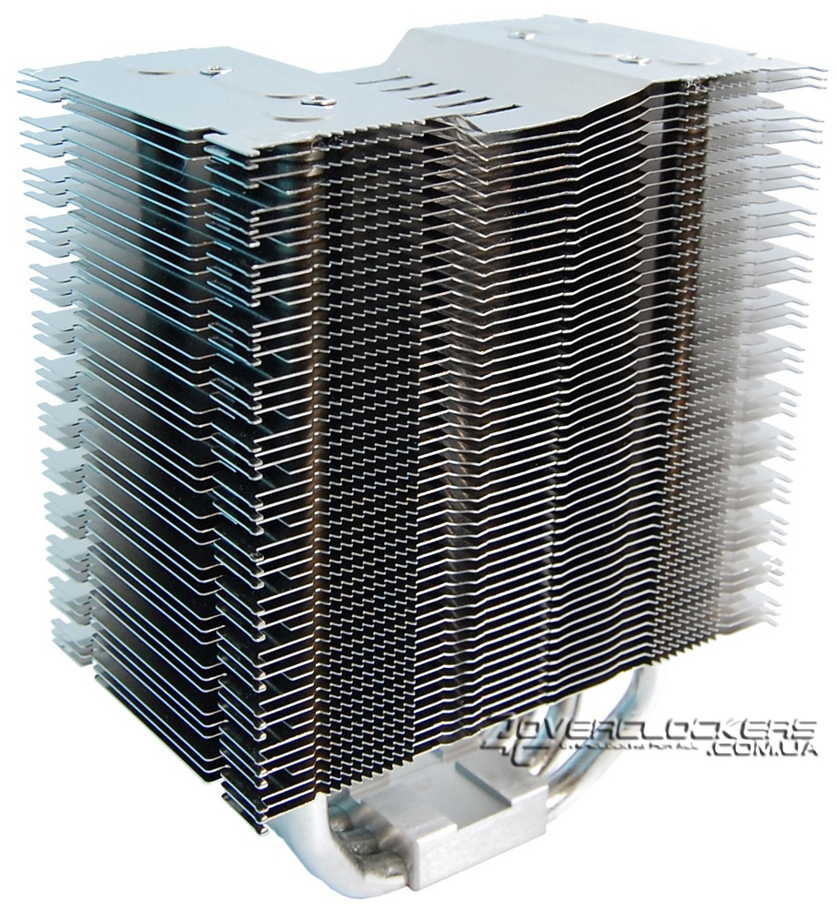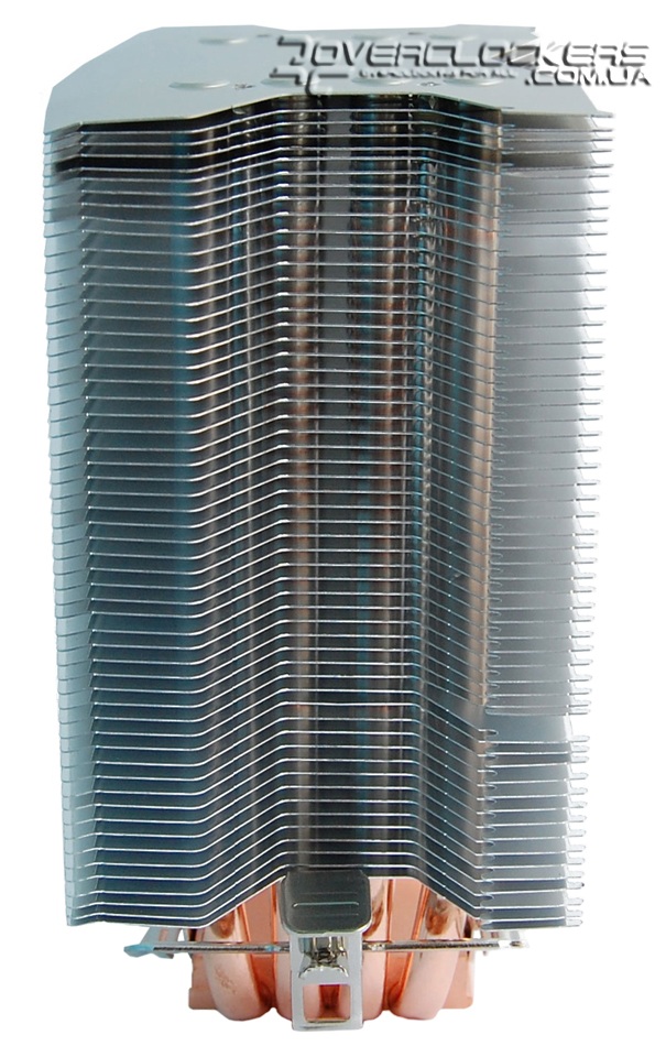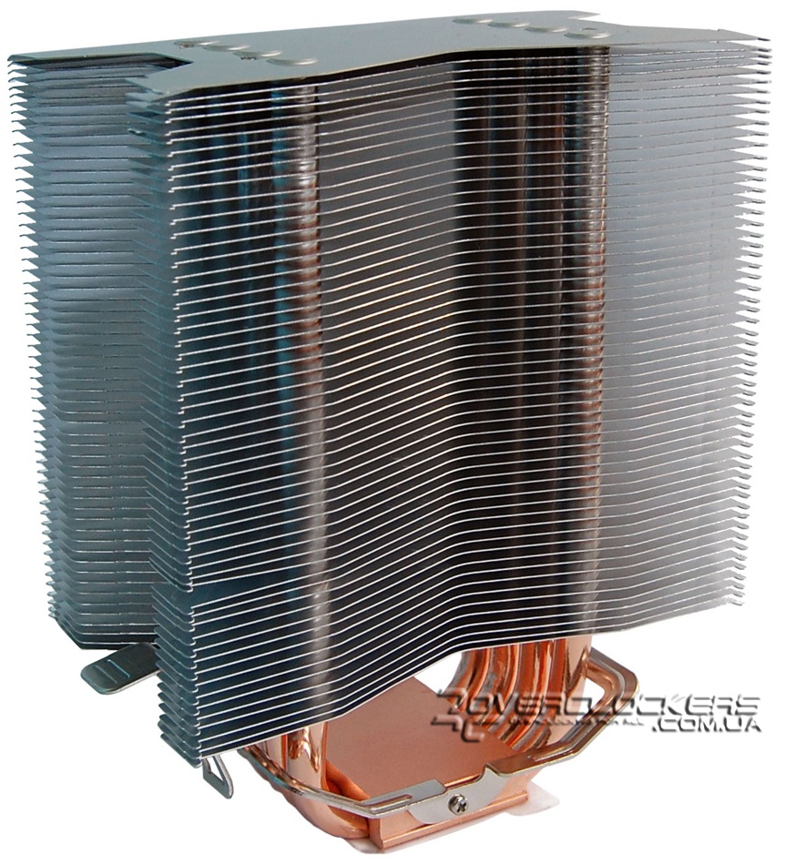 Радиатор имеет специфичную форму с выемками по бокам, что сделано с целью освободить доступ к защелкам системы крепления. С задней стороны пластины имеют выпуклую заостренную форму, да и небольшие пазы для установки вентилятора имеются в радиаторе лишь с одной стороны, что исключает возможность установки второго вентилятора. А второй вентилятор данному кулеру, возможно бы, и не помешал, ведь он выполнен по технологии HDT (heatpipe direct touch), т.е. его тепловые трубки напрямую контактируют с крышкой процессора, следовательно, и эффективность его должна находиться на высоком уровне.