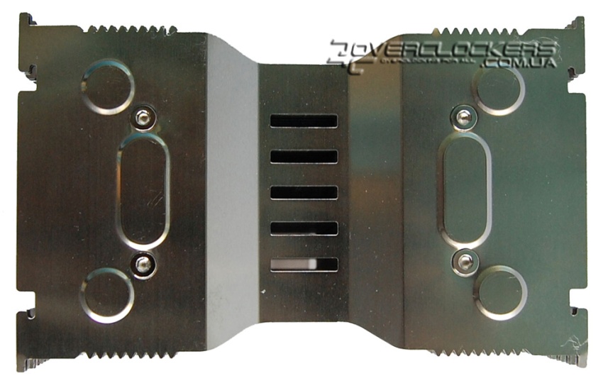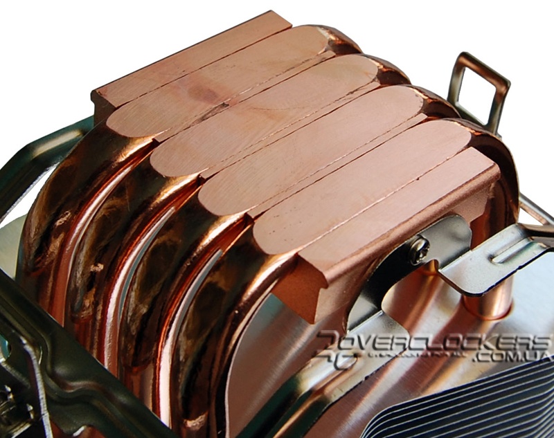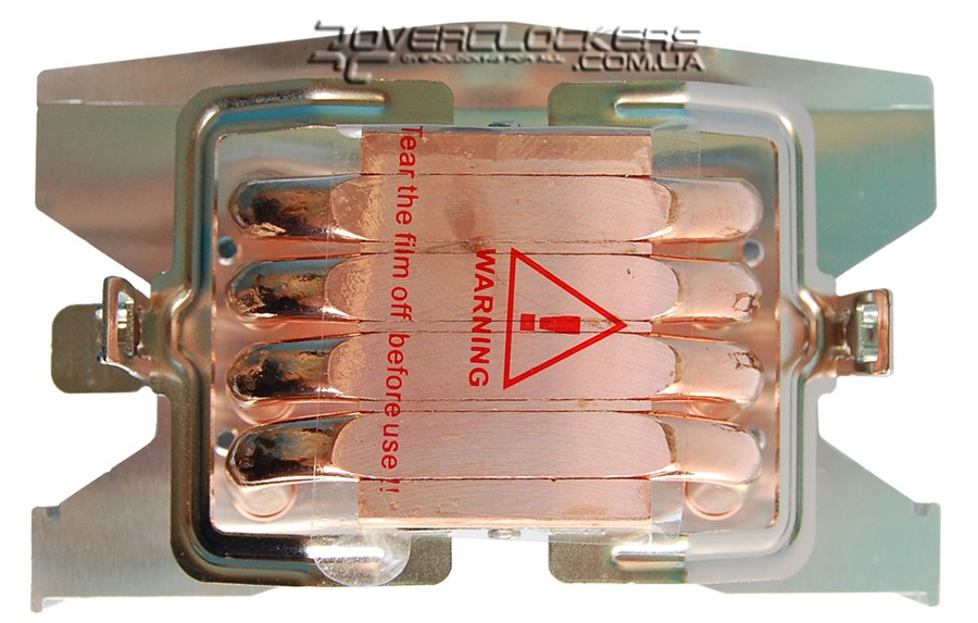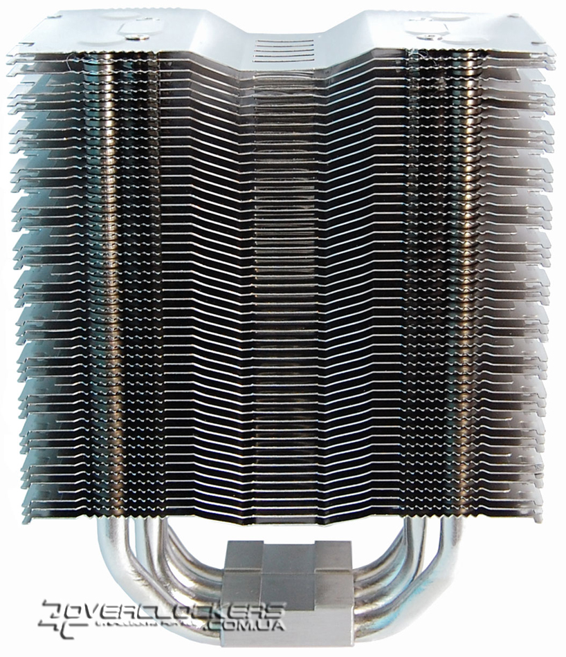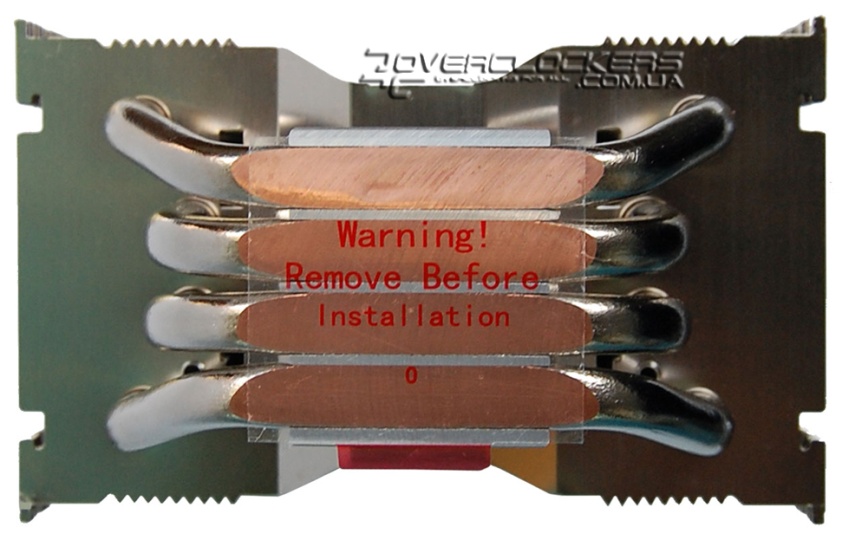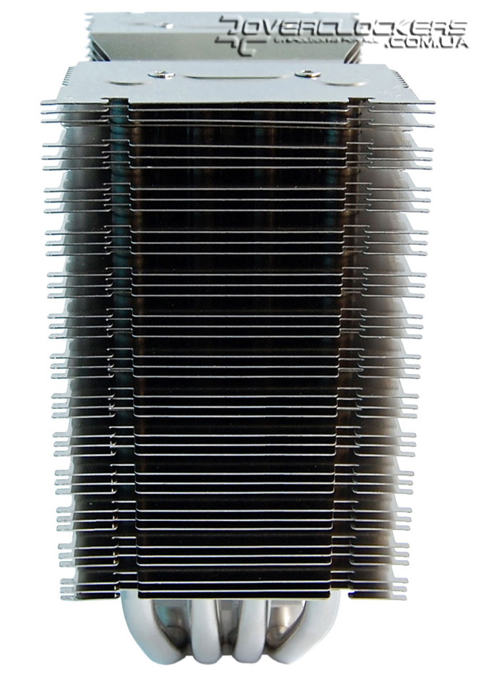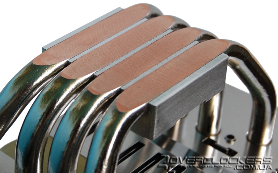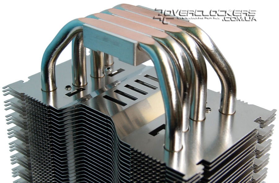 На верхней пластине по традиции красуется логотип компании, только уже другой. Перфорированных отверстий в пластинах нет. Тепловые трубки, как и в прототипе, пронизывают пластины радиаторы с небольшим смещением, чтобы более равномерно распределить по ним тепловую нагрузку.