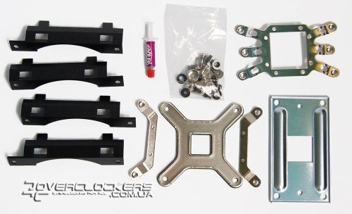 Установка на платформу AMD мало чем отличается от установки на Socket LGA 775. Вам нуеобходимо будет лишь прикрутить другую усилительную пластину и специальную крепежную рамку. Кстати, крепление позволяет устанавливать кулер на платы не только с 4 крепежными отверстиями, но и с двумя. Есть возможность установки кулера на любую платформу без усилительной пластины, тогда вместо нее под фиксирующие гайки подкладываются специальные пластиковые кольца. Но при весе конструкции мы бы не рекомендовали это делать.