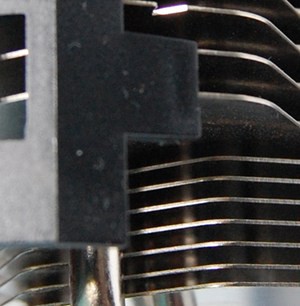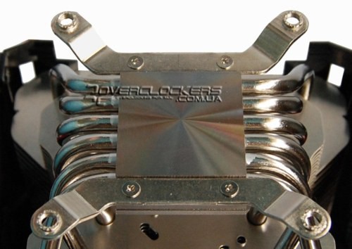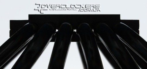 Боковые секции радиатора насажены на две тепловые трубки. Причем эти трубки нагружены только одной секцией, т.е. по две задействовано с каждой стороны на отдельный радиатор, в итоге используется всего четыре трубки. Оставшиеся четыре имеют уже U-образную форму и пронизывают сразу две центральные секции. Причудливо изгибаясь у основания, они равномерно пронизывают пространство радиаторов, что, опять же, помогает равномерно распределить нагрузку. Две из этих четырех трубок пронизывают лишь 2х48 больших пластин, в то время как на остальные приходится уже все 2х58 пластин.