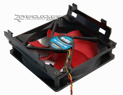 Что касается крышки с вентилятором, то, как вы уже догадались, она съемная. Точно так же при желании можно заменить и родной вентилятор на что-то другое. Хотя предустановленный вентилятор A120-25-20RB-4DP-F1 диаметром 120 мм имеет нестандартную конструкцию с сильно изогнутыми лопастями, которые должны обеспечивать ему преимущество над обычными моделями. Он имеет прозрачную крыльчатку, а в углы пластикового корпуса вмонтированы светодиоды. Крепится он к крышке за счет обычных защелок и для гашения вибрации под место соприкосновения подложены мягкие подушечки.