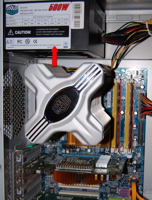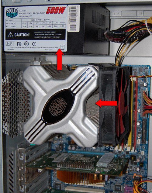 Традиционно тесты кулеров мы стараемся проводить в закрытом корпусе (за исключением, если они в него просто не помещаются). И тут надо отметить, что в любом корпусе даже при отсутствии каких-либо корпусных вентиляторов создаются вытяжной поток вентилятором в блоке питания (который отмечен красной стрелкой на изображении). Так что даже без вентилятора кулер частично продувается. Но из-за расположения блока питания, правая часть радиатора продувается слабее. Тестирование в пассивном режиме мы проводили именно в такой конфигурации, а чтобы уменьшить влияние блока питания, вентилятор в нем был заменен на низкообротистый.