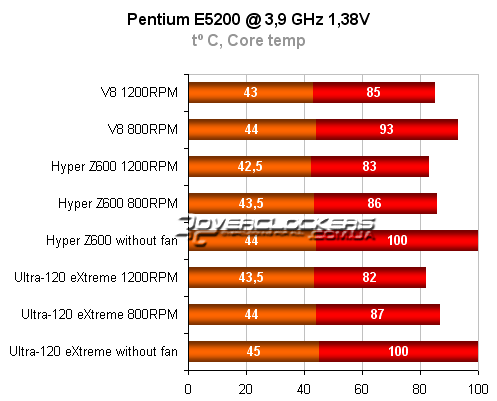 В полностью пассивном режиме ни один из кулеров не смог выдержать испытание стресс-тестом Intel Burn Test, температура достигала критической отметки в 100 градусов, после чего включался тротлинг. Но надо отметить, что если с Hyper Z600 это происходило на 18 минуте теста, то с Ultra-120 eXtreme уже на 9 минуте. Cooler Master V8 хоть в этом режиме и не тестировался, но он даже при 800 оборотах вентилятора не особо проявил себя, позволив температуре подняться выше 90 градусов. В этом режиме результаты двух других кулеров оказались лучше на 6-7 °C. При 1200 оборотах отставание V8 уменьшается до 2-3 градусов. Hyper Z600 хоть и является лидером, но Ultra-120 eXtreme уступает ему мизерный 1 °C.