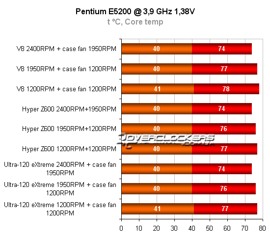 На этом графике видно, как благосклонно на температуре сказывается появление второго вентилятора в системе, даже если он крепится не к кулеру, а на заднюю стенку корпуса. И тут уже, независимо от скорости вентиляторов, наблюдаются идентичные результаты Hyper Z600 и Ultra-120 eXtreme. V8 хоть и является аутсайдером, но таковым назвать его тяжело, ведь он проигрывает соперникам всего лишь один градус. Использование сверхмощного вентилятора на 2400 оборотов в минуту с мощным корпусным вентилятором уравнивает уже абсолютно всех, и максимальная температура со всеми кулерами оказывается одинаковой.