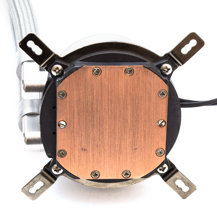 Медное основание с продольной шлифовкой имеет вид усеченного овала с габаритами 56х62 мм. Производитель позаботился о том, чтобы вскрыть водоблок было максимально сложно, прикрутив подошву не только восемью винтами с треугольной шляпкой, но еще и двумя винтами под плоскую отвертку с выступами, которые можно закрутить лишь в одном направлении и нельзя провернуть назад. К ровности основания особых претензий нет. Для подключения к питанию помпы имеется один трехконтактный кабель, а для работы подсветки есть разъем +5VDG, оба длиной 300 мм.