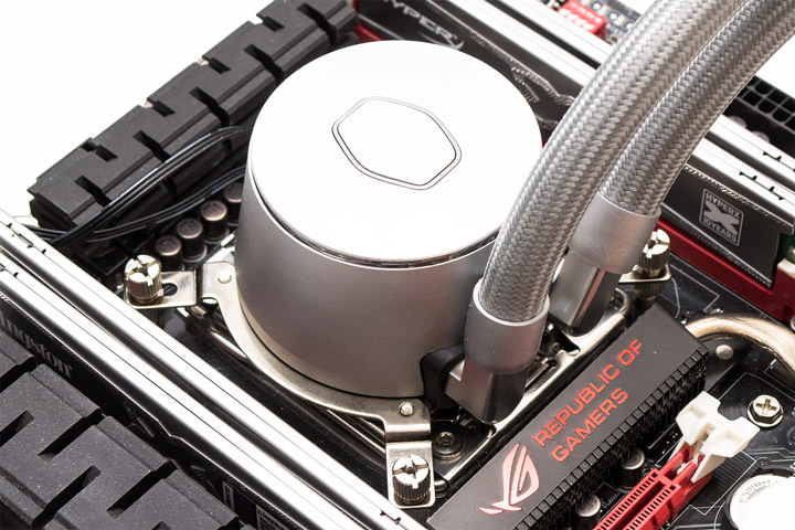 Определяющей чертой во внешности MasterLiquid ML360P является его серебристо-серая окраска. В сочетании с квадратными формами радиатора, окрашенными ребрами и шлангами система выглядит весьма симпатично. Длина шлангов составляет 410 мм, они заключены в нейлоновую оплетку и имеют внешний диаметр 13 мм. Они достаточно гибкие и прочные.