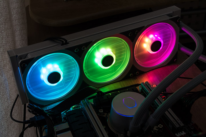 Cooler Master MasterLiquid ML360P Silver Editon — это очень красивая, но не самая эффективная система жидкостного охлаждения. Из главных преимуществ, помимо элегантного дизайна и ARGB-подсветки, хочется особенно отметить практически бесшумную помпу, что даже сейчас встречается редко. Из инноваций стоит выделить совмещенный блок из трех вентиляторов. Основная прелесть такого решения состоит в гораздо меньшем количестве проводов, требуемых для подключения всей системы в целом. Ну и комплектный ARGB-контроллер позволит использовать данную СВО даже обладателям не самых навороченных материнских плат, без подходящих разъемов подсветки.