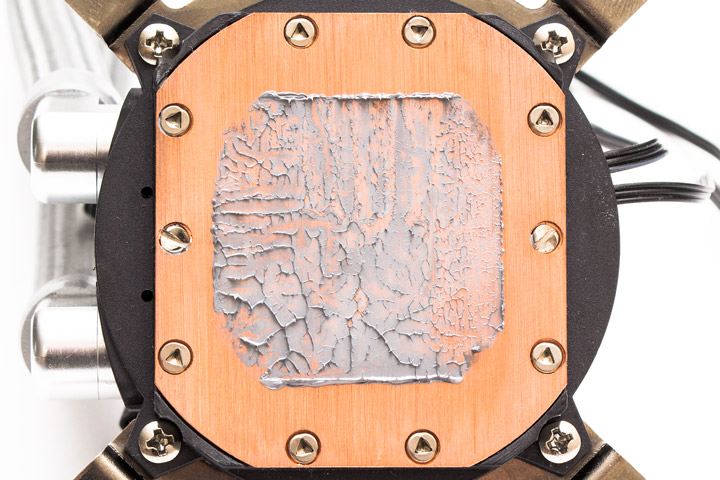 Осталось нанести термоинтерфейс и поставить водоблок на место, прикрутив его четырьмя гайками. Затягивать их нужно последовательно и равномерно, по несколько оборотов за раз. В финале останется подключить все провода в подходящие разъемы.