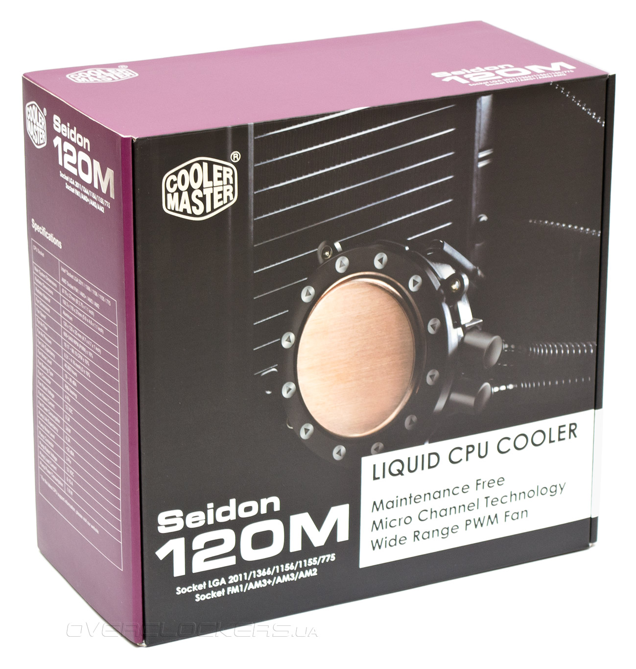 Кроме изображения водоблока на фронтальной и боковой частях, с обратной стороны приведены детальные характеристики Cooler Master Seidon 120M в графическом и текстовом виде.